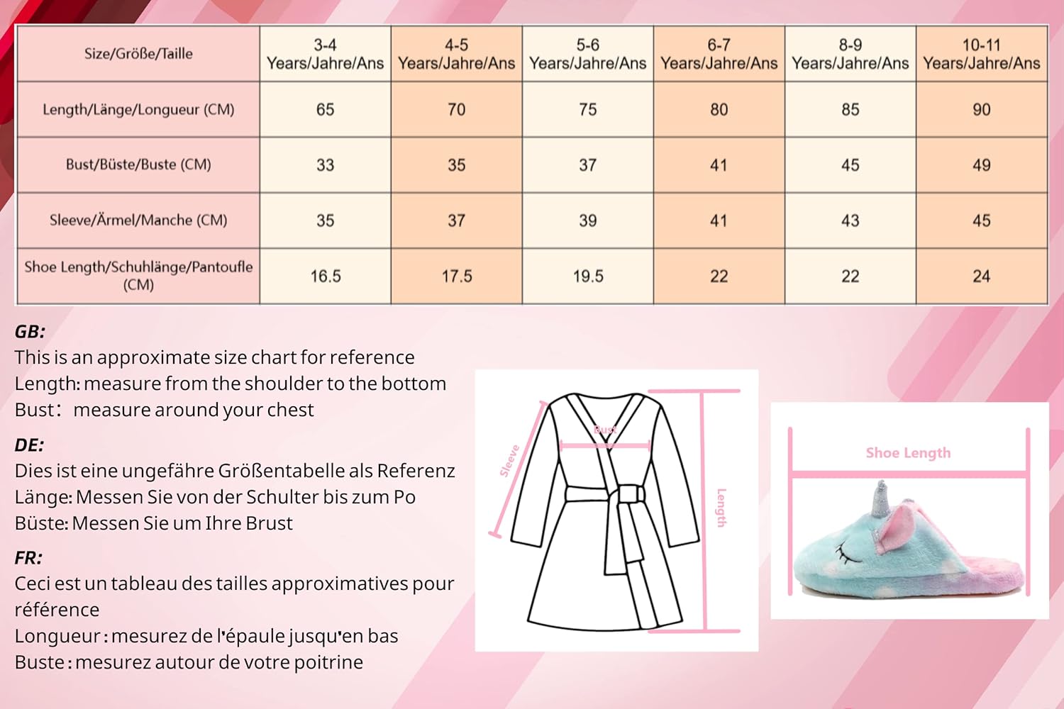 - 1 Einhorn-Bademantel, 1 Einhorn-Stirnband, 1 Einhorn-Augenbinde und 1 Paar Einhorn-Pantoffeln