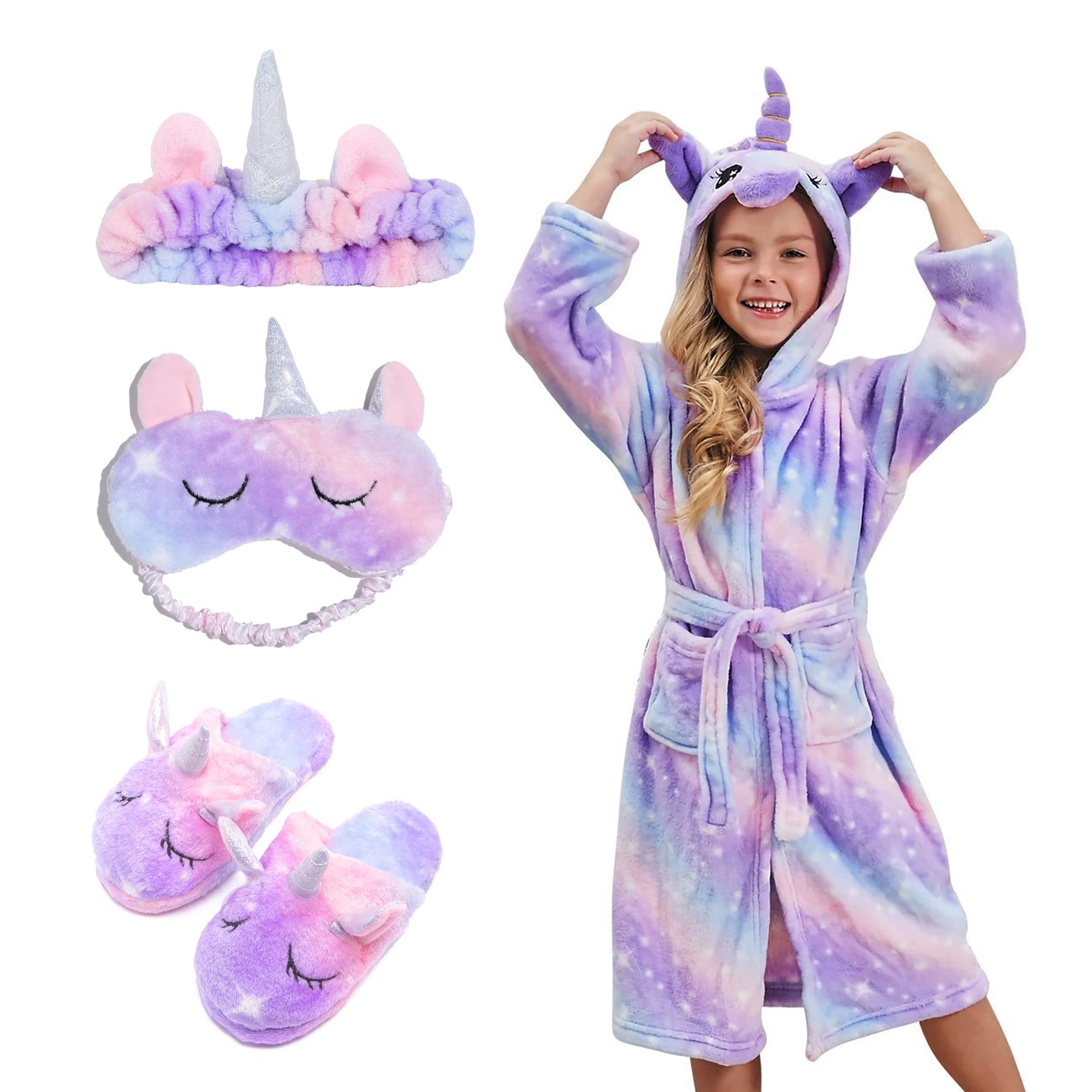 - 1 Einhorn-Bademantel, 1 Einhorn-Stirnband, 1 Einhorn-Augenbinde und 1 Paar Einhorn-Pantoffeln