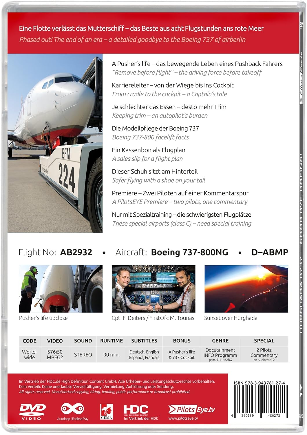 PRODUKTBESCHREIBUNGEN PRODUKTBESCHREIBUNG PilotsEYE.tv zeigt in Folge 17 Good Bye, Boeing Ausgeflottet einen der letzten Flüge mit einer Boeing 737 der airberlin nach Ägypten ans rote Meer. Die legendäre Boeing 737 ist das meistgebaute kommerzielle Flugzeugmodell der Welt. Seit ihrem Erstflug 1967, wurden bis heute fast 9000 Exemplare hergestellt. In einigen deutschen Airlines kündigt sich für die 737 nun der wohlverdiente Ruhestand an. Aus Gründen der Effizienz wird airberlin die vor zwei Jahren begonnene Ausmusterung der Boeing-Flotte mit Ende des Jahres abgeschlossen haben und in Zukunft nur noch mit Airbus-Flugzeugen operieren. PilotsEYE.tv hatte die Gelegenheit, einen der letzten Flüge ins sonnige Ägypten zu begleiten. Erstmals gemeinsam kommentiert von beiden Piloten, bietet Episode 17 die Möglichkeit, einen kompletten Umlauf von München in den Badeort am roten Meer hautnah mitzuerleben. Mit zehn Kameras in einem derart kleinen Cockpit zu filmen stellte auch die Filmemacher vor Herausforderungen. Zwei Profis nehmen Abschied Dem Anlass angemessen, treffen sich die beiden Piloten CPT Florian Deiters und F/O Michail Tounas am Vorabend des Fluges im Münchner Hangar, um sich ihre 737-800NG noch einmal aus der Nähe anzusehen. A Pusher s Life die treibende Kraft am Boden Diesmal sind die Flugvorbereitungen auch aus Sicht eines Pushers zu sehen. Karriereleiter von der Wiege bis ins Cockpit Wenn der Vater den Sohn bereits als Baby in seiner Cessna mitnimmt und dieser dann Pilot wird, kann man wohl von einer einschneidenden Prägung in der Kindheit sprechen. Je schlechter das Essen, desto mehr Trim Wenn viele Passagiere plötzlich auf die Toilette gehen, hat der Autopilot eine Menge zu tun , erzählen die Piloten beim Thema der richtigen Fluglage. Die Route nach Hurghada München (de) St. Johann (at) Villach Lubljana (si) Mostar (ba) Dubrovnik (hr) Ioannina (gr) Kreta al Fayyum (eg) Hurghada (eg) Kairo Rhodos (gr) Kraljevo (se) Maribor (si) Graz (at) Salzburg München (de) Ausgesucht Wo selbst Piloten ins Schwitzen geraten Flughäfen werden in Schwierigkeitsgrade eingeteilt. Welche Flughäfen neben Funchal und Sarajevo zur Klasse C gehören, verrät der Copilot. Ausgedruckt Dieser Kassenbon ist ein Flugplan Wenn der Thermodrucker in der Mittelkonsole druckt, ist das tatsächlich der Flugplan für den Rückflug und kein Kassenbon. Technische Leckerbissen 4 Bonusteile nur auf Disc Bonus I A Pusher`s Life die treibende Kraft am Boden Bonus II Anwohner lieben das GLS Präzisions-Anflugverfahren Bonus III Spannung an Board das Overheadpanel Bonus IV Electric Light Orchestra Die Kraft der zwei Birnen Zwei Piloten ein Kommentar Erstmals kommentieren die Piloten die zu sehenden Ereignisse und Prozeduren. UNTERTITEL: ENGLISCH DEUTSCH FRANZÖSISCH SPANISCH (Nur Video on Demand: CHINESISCH) REZENSION Air Berlin 737-800 Retirement After decades of flying a specific type of aircraft, it s always a sad moment to see the retirement of an aircraft that has had a close connection to the men and women who fly it. In this programme, we will be following Captain Florian Deiters and First Officer Michail Tounas, as they fly one of the final flights of the B737-800 operated by Air Berlin from Munich to Hurghada. As is the case with most aviation documentaries, we begin by joining the crew in the cockpit of the 737-800 as they complete their departure briefing and other flight preparations. For anyone who is interested in what takes place in the cockpit prior to departure, this segment may be especially insightful. Another interesting segment is the pushback process which was captured from a perspective that is seldom seen by the travelling public. With cameras mounted on the tug itself, viewers for the first time will have the opportunity to see the entire pushback process showing how the aircraft is connected, elevated and controlled by the tug. This was a very insightful segment of this programme and I think everyone will find it intriguing. After taxi and takeoff, we have the privilege of seeing some of the most stunning views from the cockpit of the 737. During our flight to Hurghada, the Captain discusses many interesting topics such as how he got into aviation and the joys of flying the B737 Classic and NG models. In the typical PilotsEYE cinematic fashion, viewers are transported from the cockpit to the Air Berlin hangar as our F.O and Capt. recount their tour of the B737 exterior to point out some of the significant changes to the 737 over the years. After a smooth night time landing in Hurghada, we rejoin the flight crew as they prepare for their return flight to Munich. For this leg of the trip, our F.O engages the viewers with a discussion on how he got into aviation which was ironically linked to a cockpit visit on a 737-200 when he was just 9 years old. Being inspired at such a young age, little did he know that he would one day fly the B737 NG. After an uneventful landing, not only does it bring this intriguing programme to an end, but it also brings an end to the operations of the B737 for Air Berlin. With the operations of this aircraft well documented in this visually and sonically stunning programme, enthusiast and Air Berlin staff will be able to reflect on and appreciate the years of service that this aircraft has given to the airline. In addition to providing moments of nostalgia for years to come, this video documentary will also be a source of entertainment for aviation enthusiast around the world for years to come. --Marlon Carter AVSIM