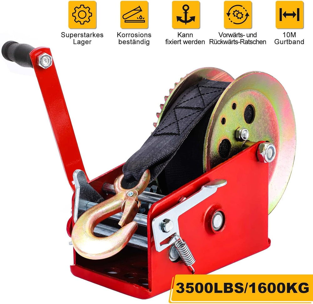 - Mit Windengurt:Die Handwinde mit 10 Gurtband bietet eine Lasthub- und Anhängelast mit 1600kg/3500 lbs, geeignet für viele Zieh- / Hebeanwendungen wie das Laden eines Bootes auf einen Anhänger, das Heben schwerer Gegenstände, Schlepper,