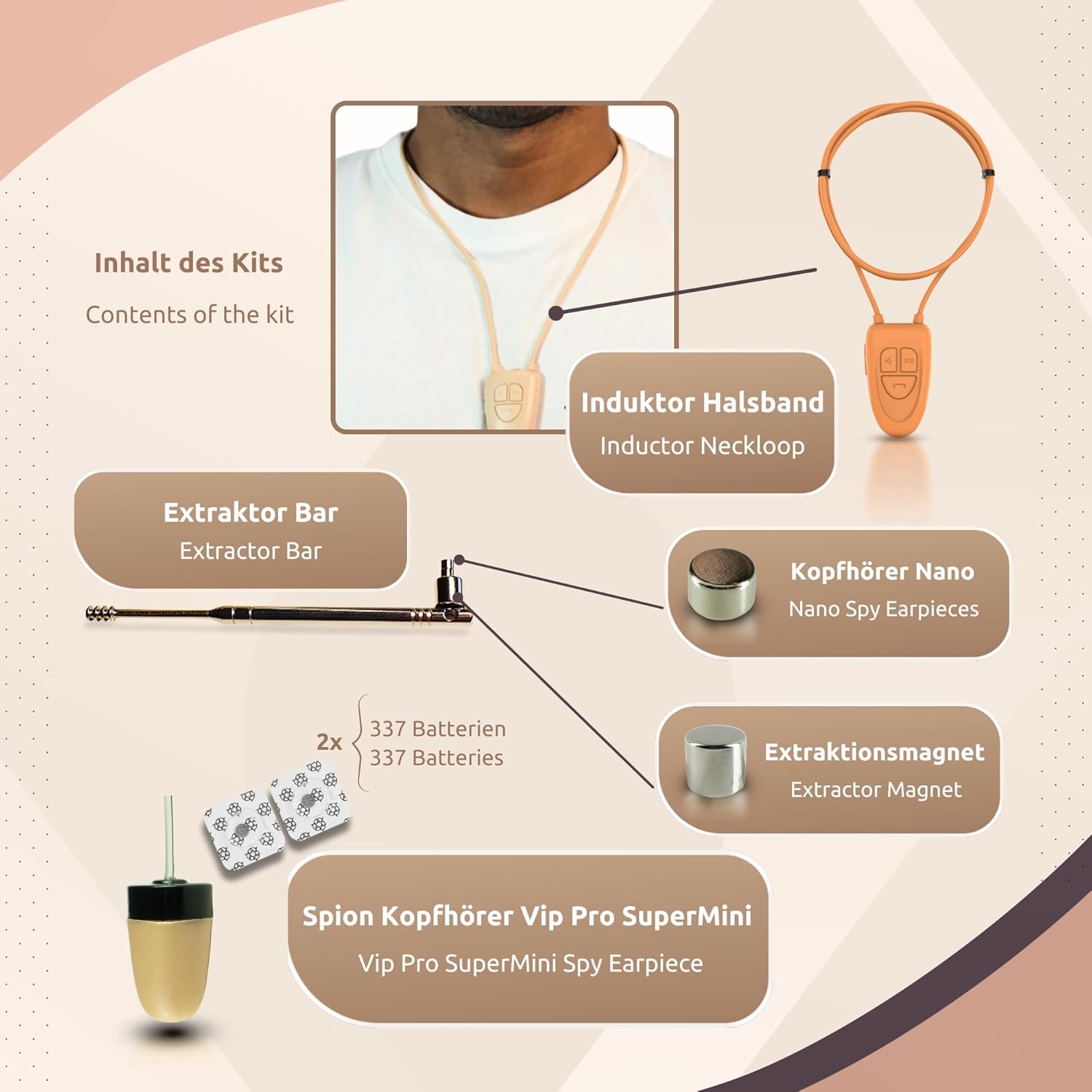 - 🔋【 Grosse Autonomie 】Induktionshalsband und Vip Pro SuperMini-Headset haben eine Autonomie von 4 Stunden. Inklusive Ladekabel, EU-Ladegerät für die Induktionsschlaufe und 2 x 337 Akkus für das Vip Pro SuperMini Headset. Der Magnet muss nicht
