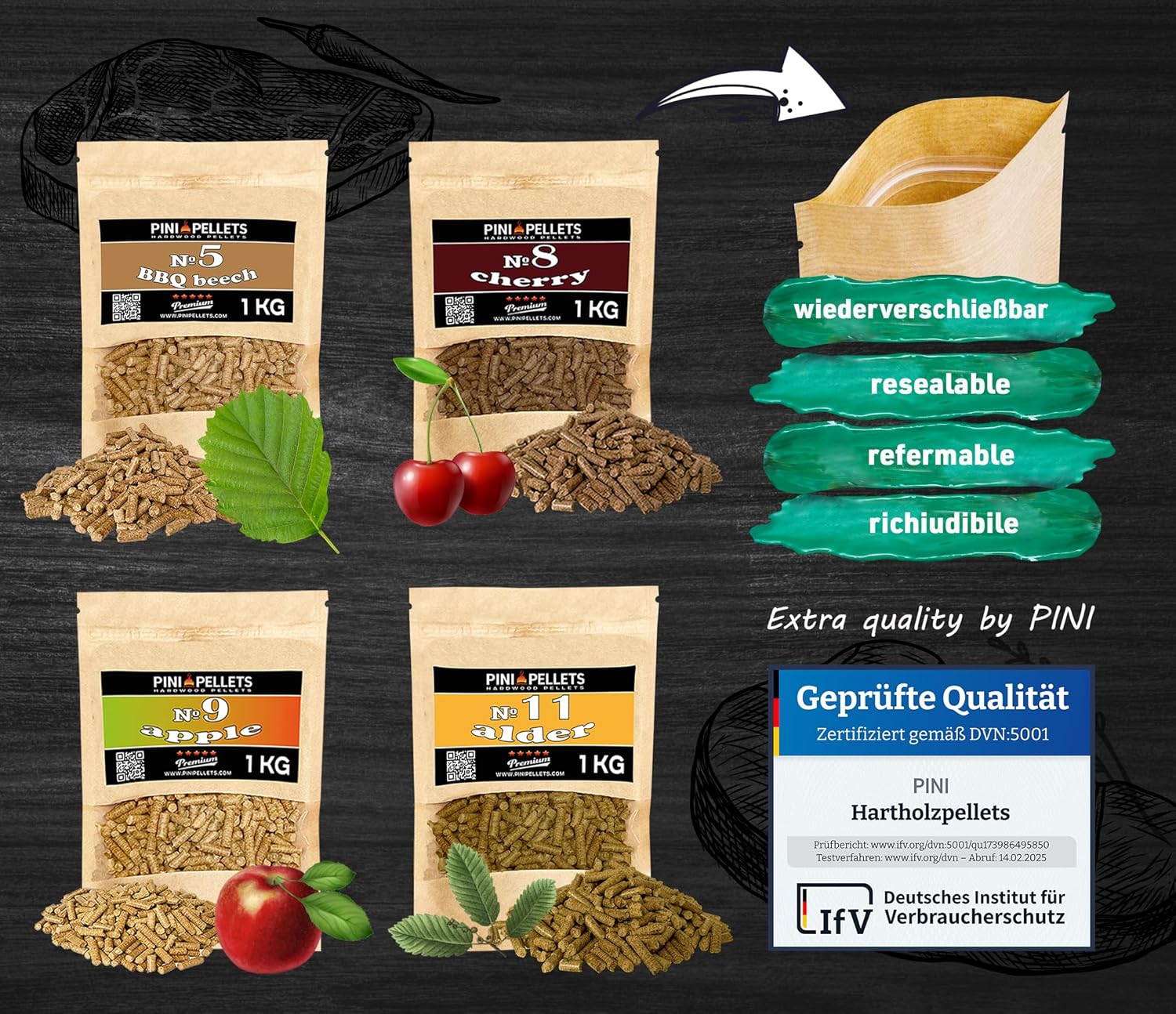 - VIELSEITIGES BBQ & RÄUCHERPELLETS SET – 4 Sorten je 1 kg: beinhaltet Buche (Nr. 5), Kirsche (Nr. 8), Apfel (Nr. 9) & Erle (Nr. 11) – für Fleisch, Fisch, Käse, Gemüse, Pizza & mehr.