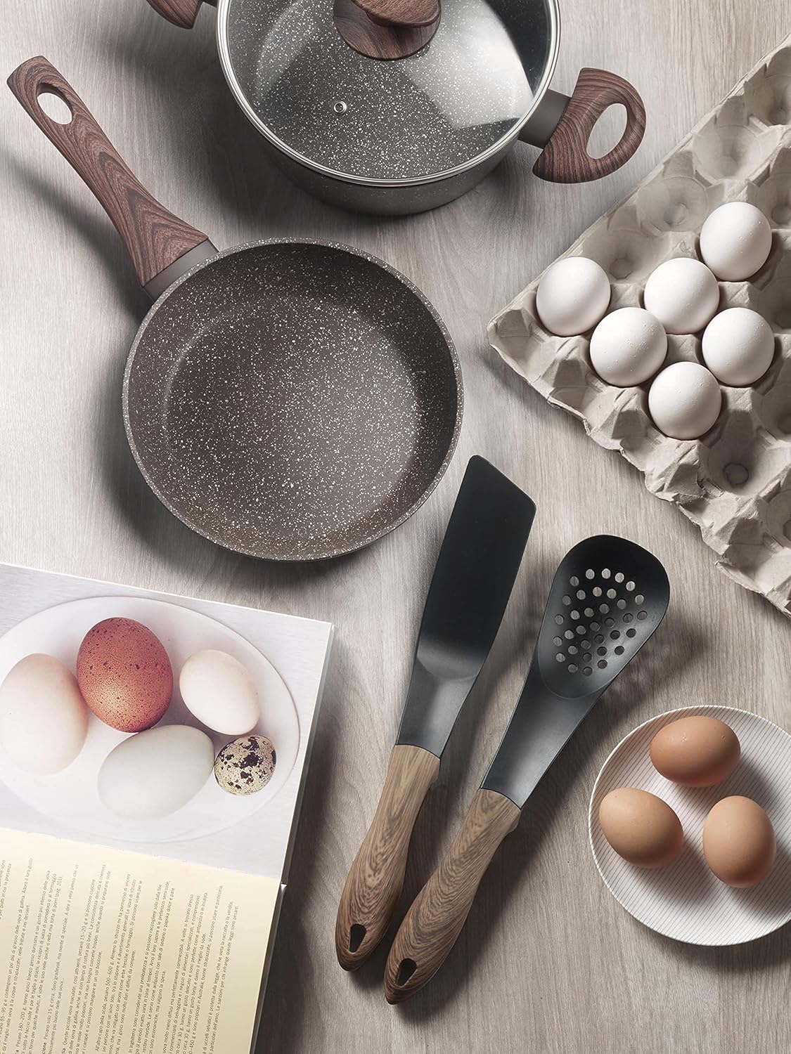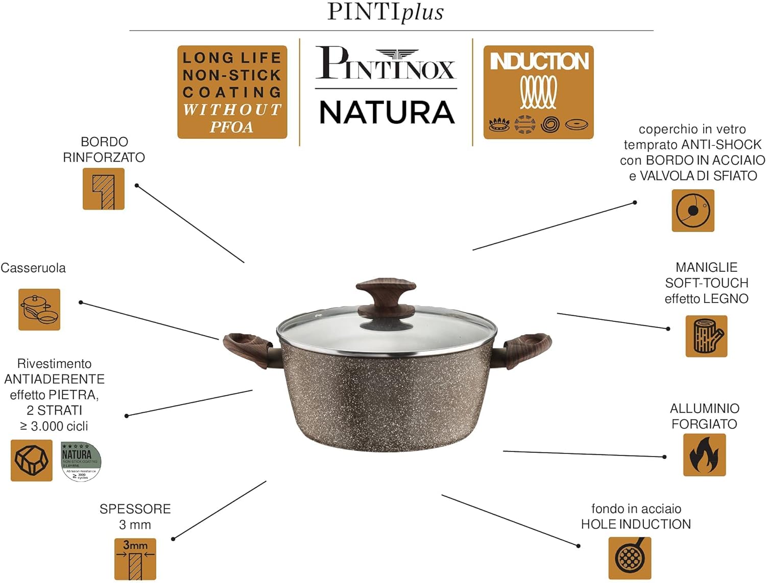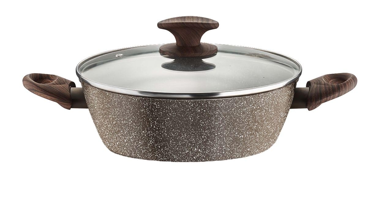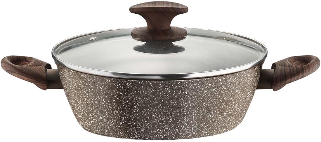 - Kasserolle mit niedrigem Durchmesser 26 cm mit Antihaftbeschichtung, 2 Schichten Steinoptik, mit Glasdeckel
