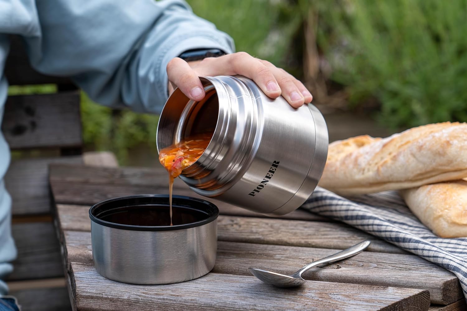 - HOHE QUALITÄT – Unzerbrechlicher Innen- und Aussenkörper aus stabilem, hochwertigem 18/10 Edelstahl, mit einem dichten, wärmegedämmten Schraubdeckel, der auch als Tasse/Schüssel dient und einer weiten Öffnung von 8 cm