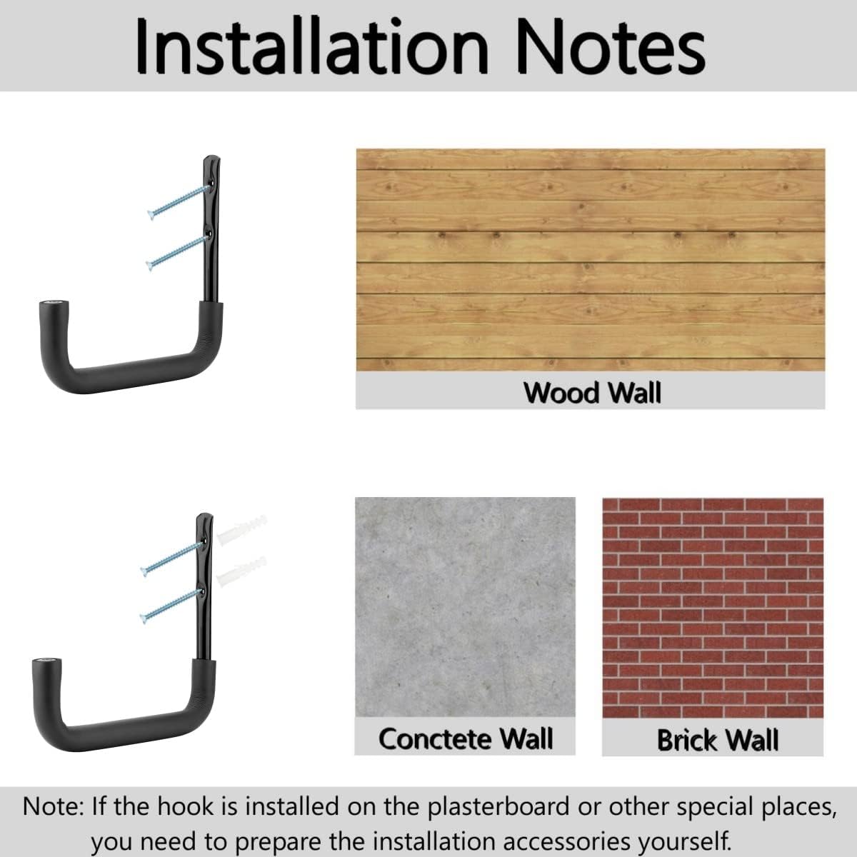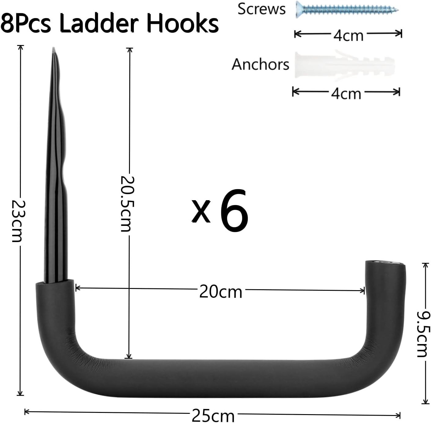 - Grösse und Paket: Dies ist ein Set von 6 Wandhalterungshaken mit 12 Schrauben und 12 Ankern. Diese grossen Leiter-Aufbewahrungshaken sind 23 cm x 25 cm (H x H), innen 20 cm breit, Schrauben und Dübel sind 4 cm lang
