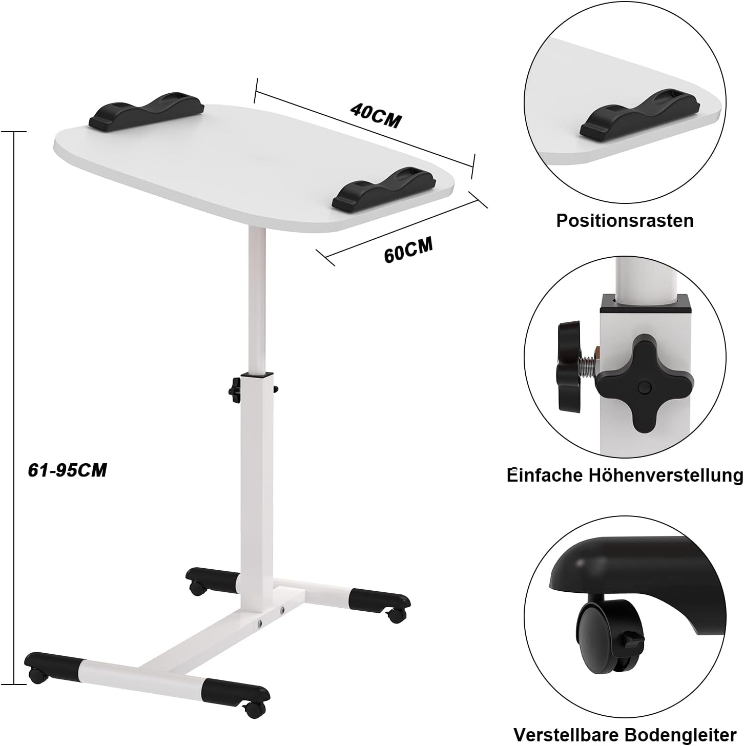 - 【Flexibel höhenverstellbar】Die Grösse der Tischplatte beträgt 60 x 40 cm Tischplatte,zwei Positionsrasten und 4 drehbare 360 ° Räder für Computer und Laptop.Die Höhenbereich der höhenverstellbarer schreibtisch lässt sich von 61 bis 95 cm
