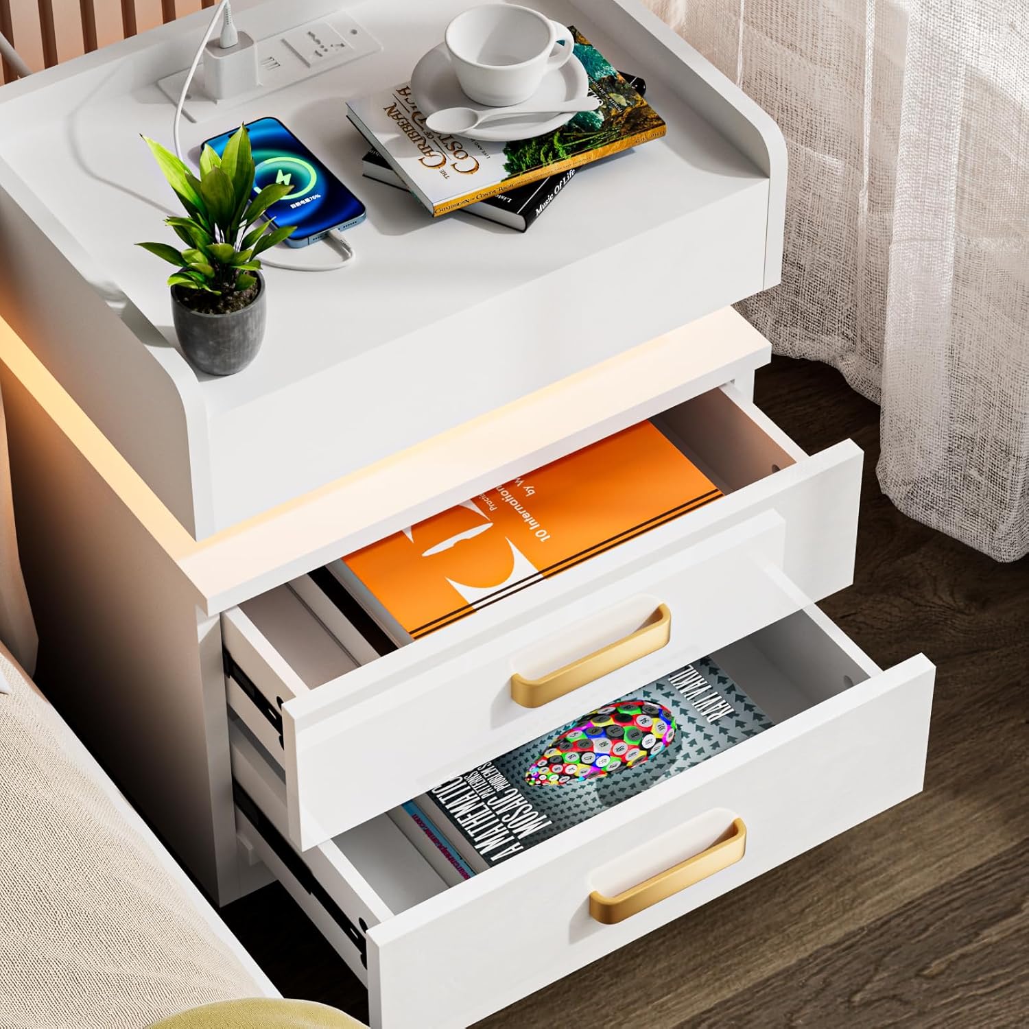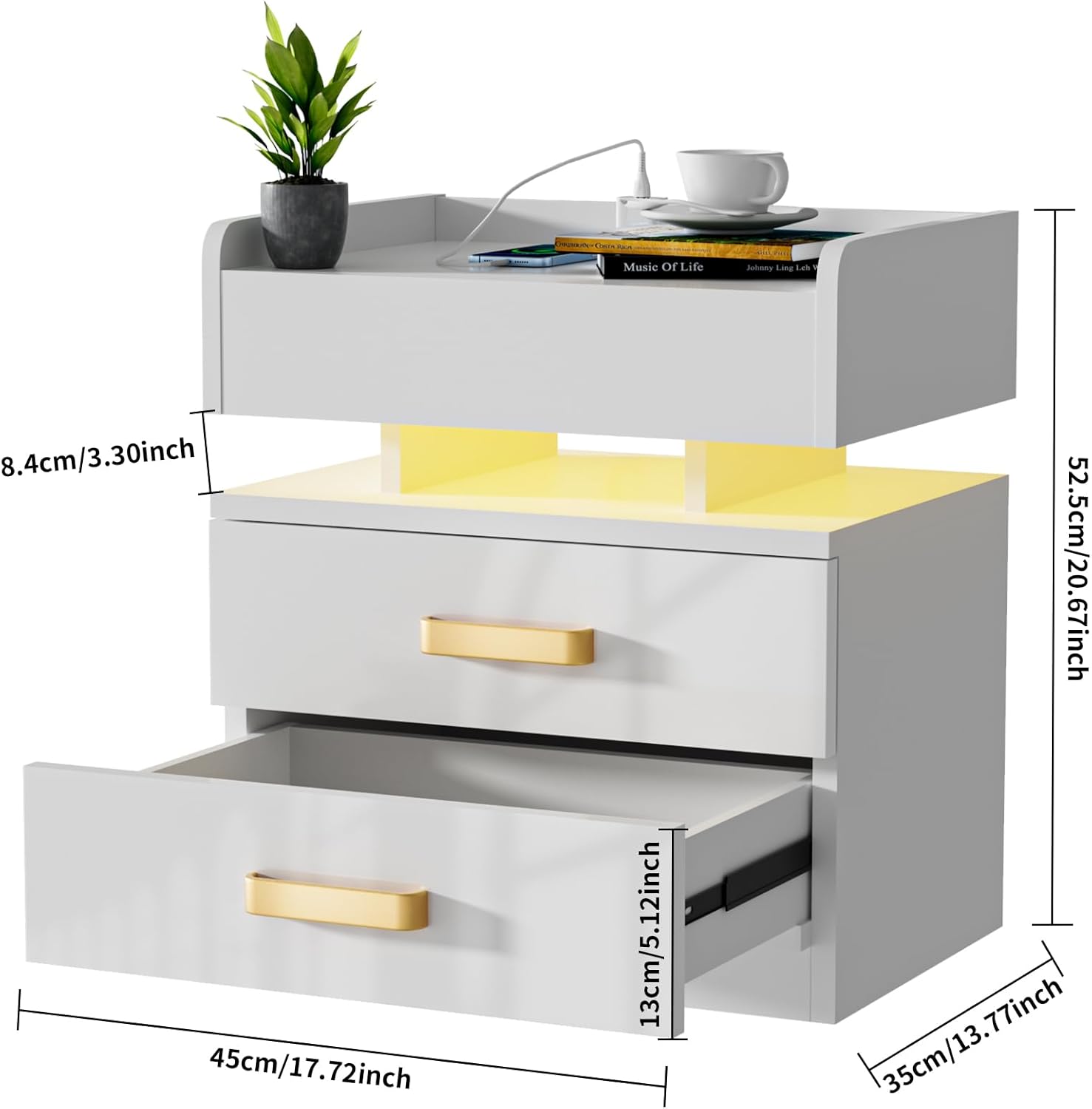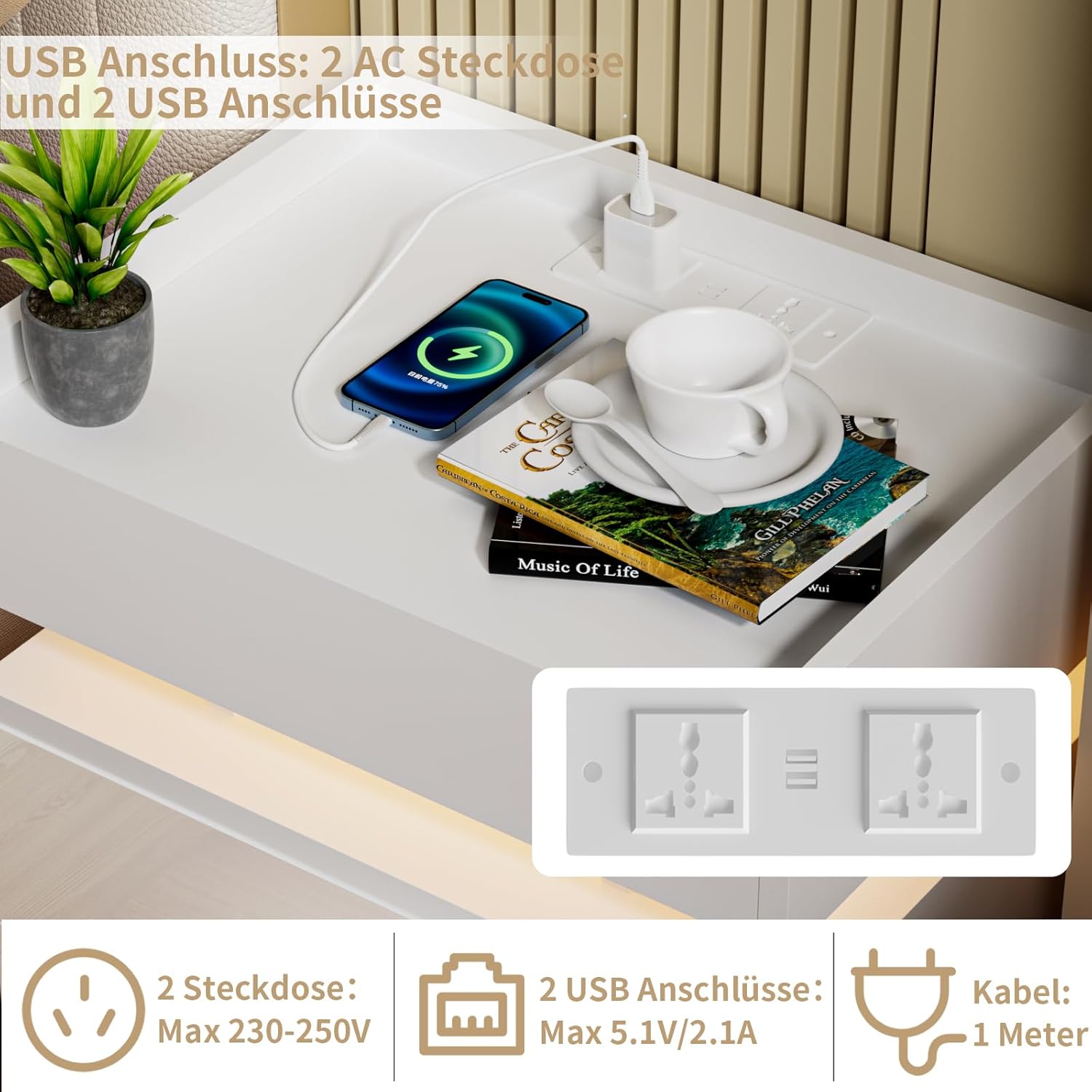 - 【AC Steckdose und USB Anschlüsse】Dieser Nachttisch ist mit einen Stecker. Der Stecker ist mit 2 AC Steckdose(Max 230-250V) und 2 USB(Max 5.1V/2.1A) Anschlüsse. Das Kabel ist 1 Meter. Dieser Nachttisch mit 2 Schubladen kann alle Ihre Speicher