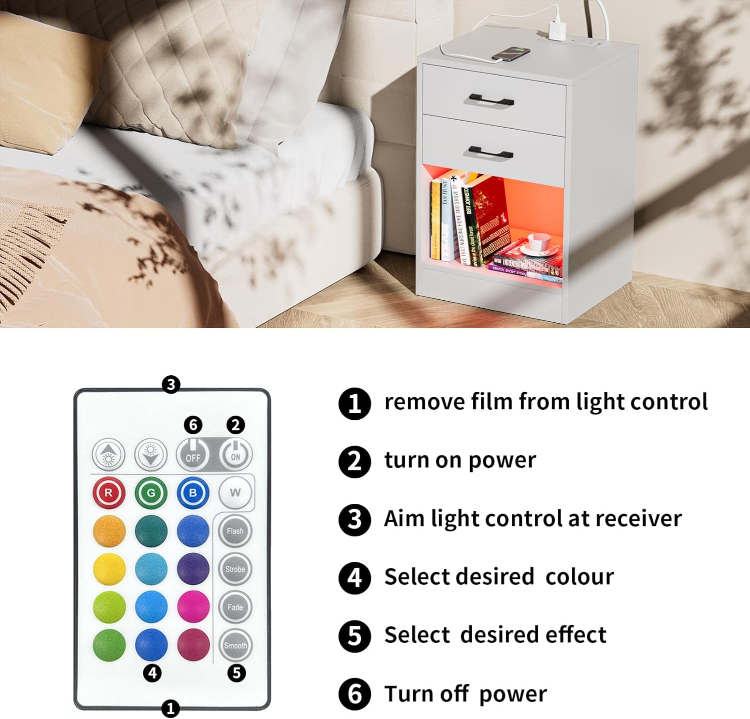 - 【Mit LED Beleuchtung】Dieser Nachttisch hat LED Beleuchtung mit 16 RGB Farben und 4 Beleuchtungseffekten wie Blitz und Verblassen ausgestattet. Und die Anzeigefarbe dieses Nachttisch kann durch Fernbedienung geändert werden.