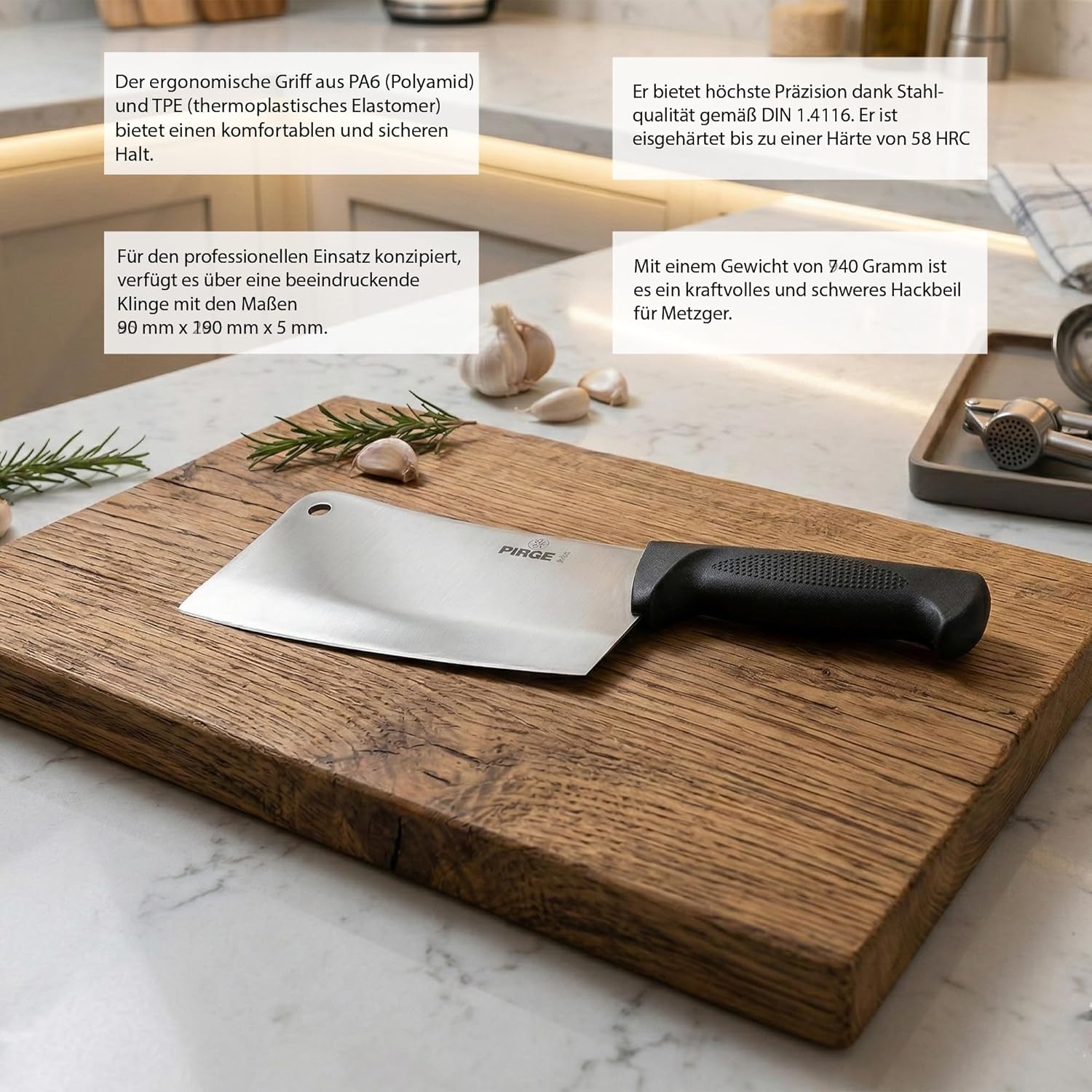- PIRGE BUTCHER'S HACKBEILE / FLEISCHBEILE: Ein beeindruckendes Hackbeile mit einer breiten 90 mm x 190 mm x 5 mm grossen Klinge für den professionellen Einsatz. Mit einem Gewicht von 740 Gramm ist dieses Hackbeil ein Schwergewicht für einen Metzger. Der