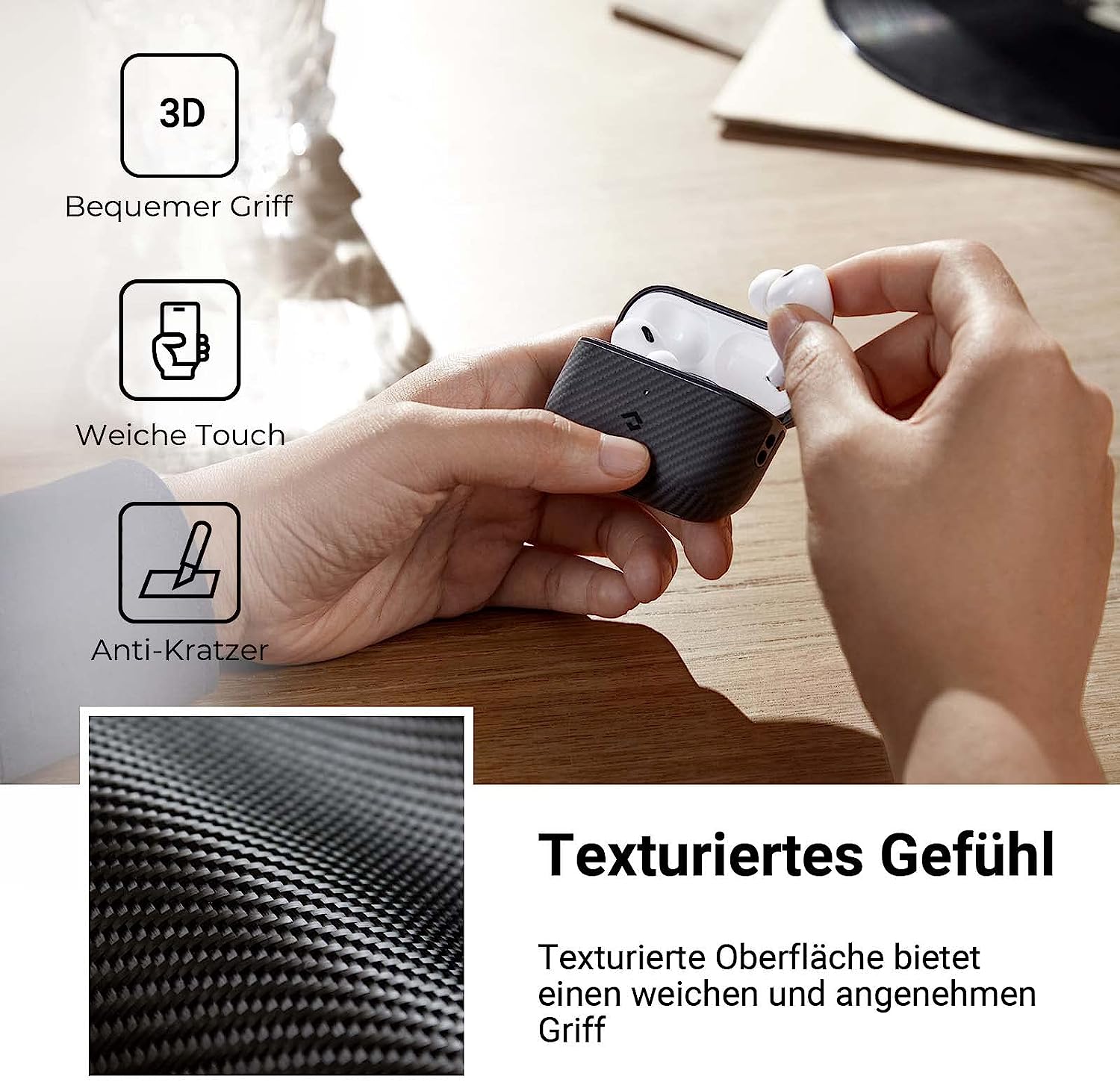 - Hochwertiger Aramidfaser: Die Hülle besteht aus 600D Aramidfaser, wodurch sie leichter und dünner ist und Ihre AirPods Pro vor täglicher Abnutzung schützt.