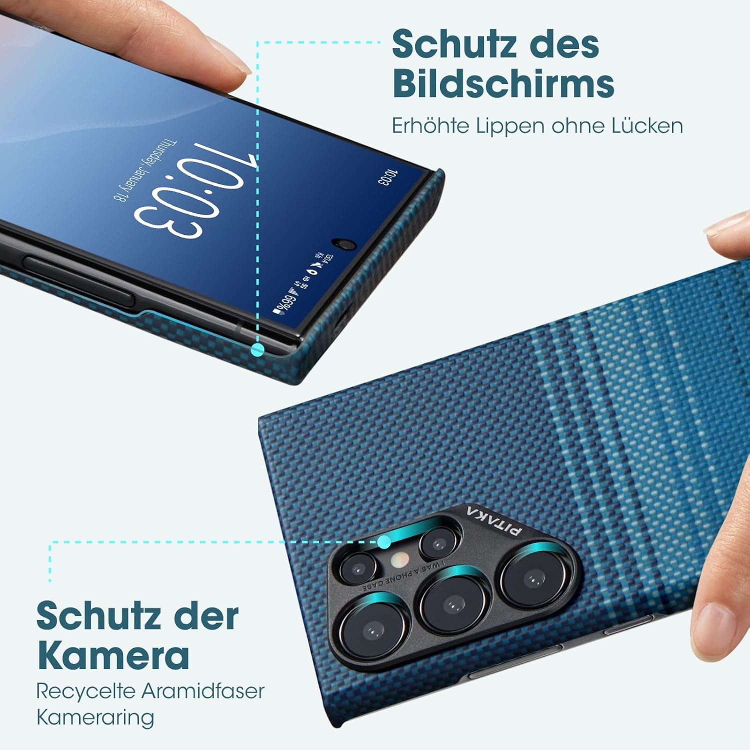 • Präziser Ausschnitt: Die Hülle hat ein halbes Wickeldesign, das sich perfekt an Ihr Handy anpasst. Geeignet für die Verwendung mit PITAKA Schutzfolien. Der Kameraring aus recycelten Aramidfasern schützt Ihre Kamera und gleichzeitig den Planeten.