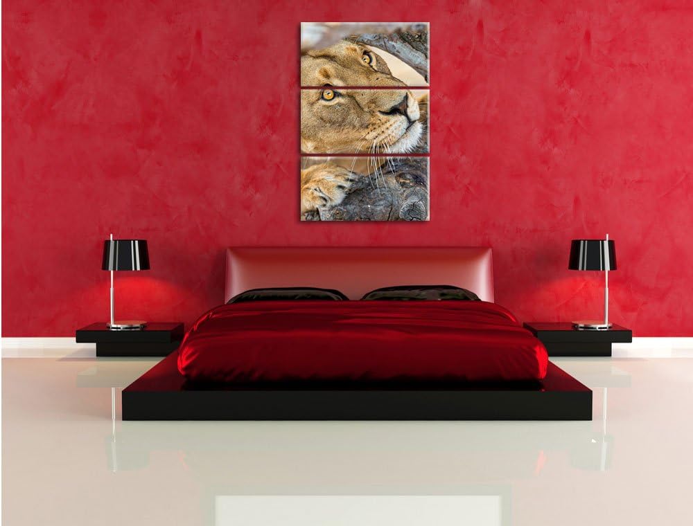 Pixxprint anpirschende Löwin 3-Teiler Leinwandbild 120x80 Bild auf Leinwand