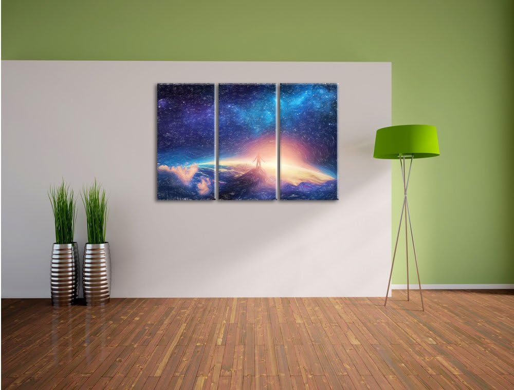 Pixxprint der Mann auf dem Berg mit dem Blick auf die Welt Kunst Buntstift Effekt 3-Teiler Leinwandb