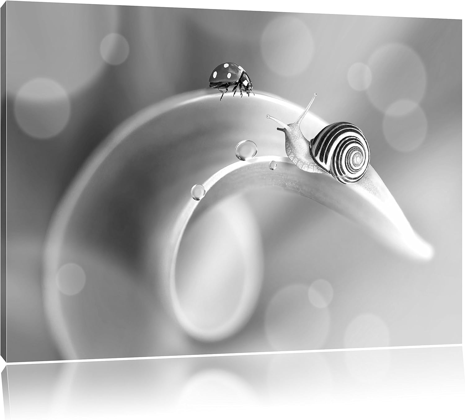 Pixxprint eine Schnecke und Marienkäfer auf Einer Pflanze Kunst B&W, Format: 100x70 auf Leinwand, ri