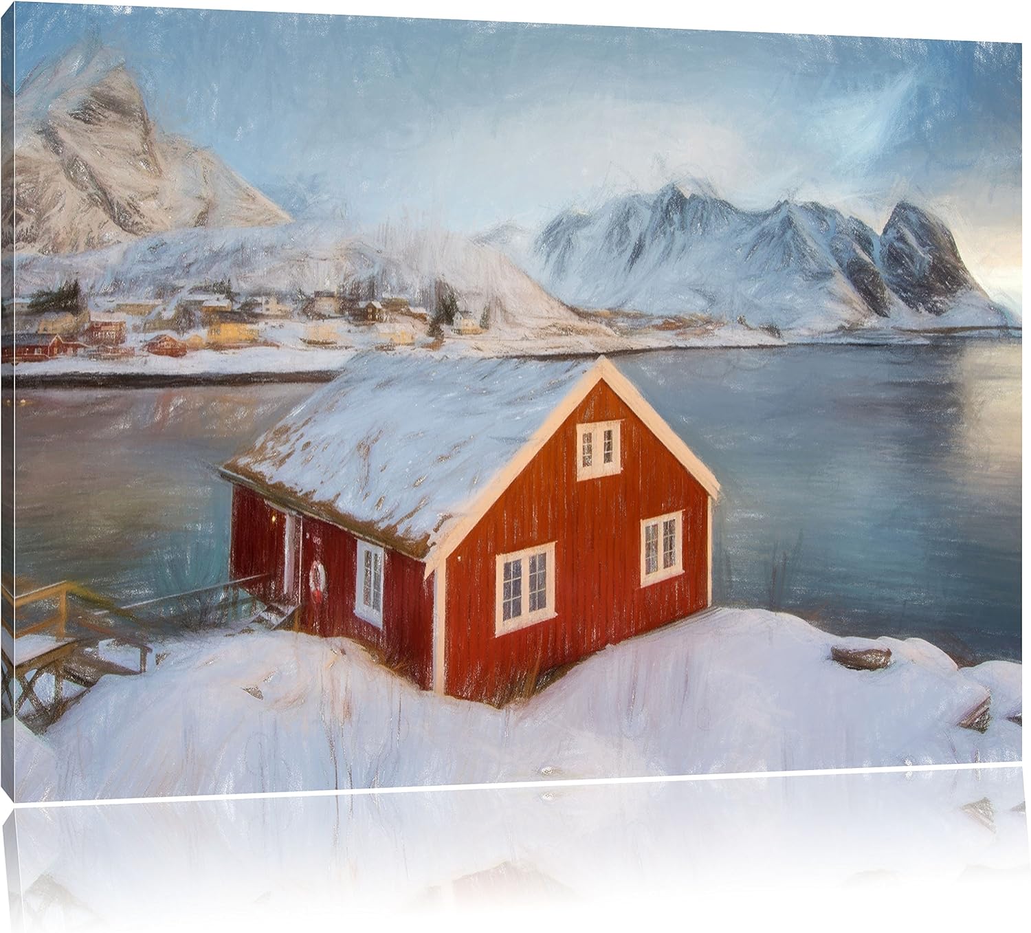 Pixxprint Fischerhaus an den Lofoten Inseln Kunst Buntstift Effekt, Format: 100x70 auf Leinwand, XXL
