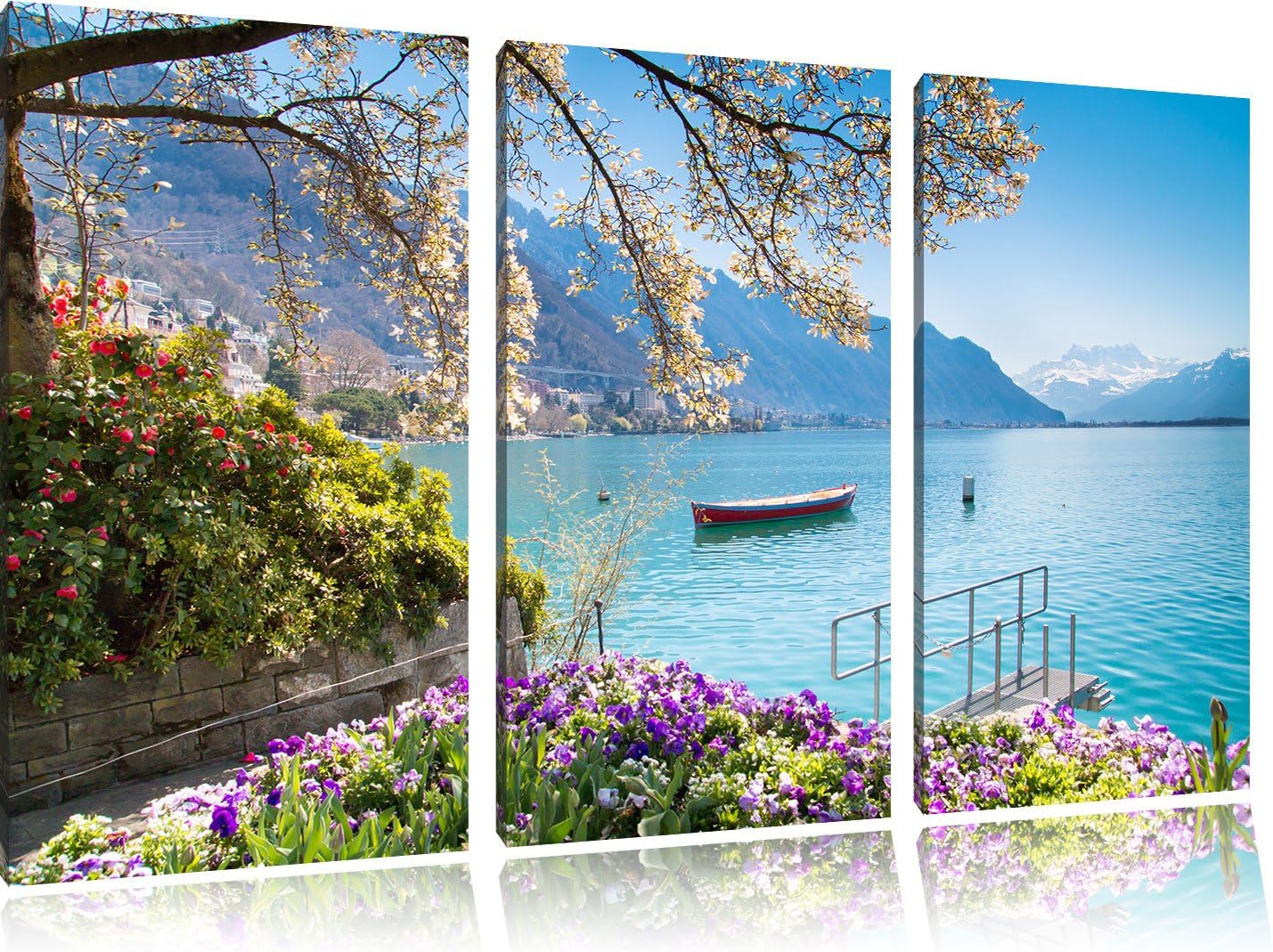 Pixxprint Genfer See im Sonnenschein als Leinwandbild | Grösse: 3 Teilig (120x80) | Wandbild| Kunstd