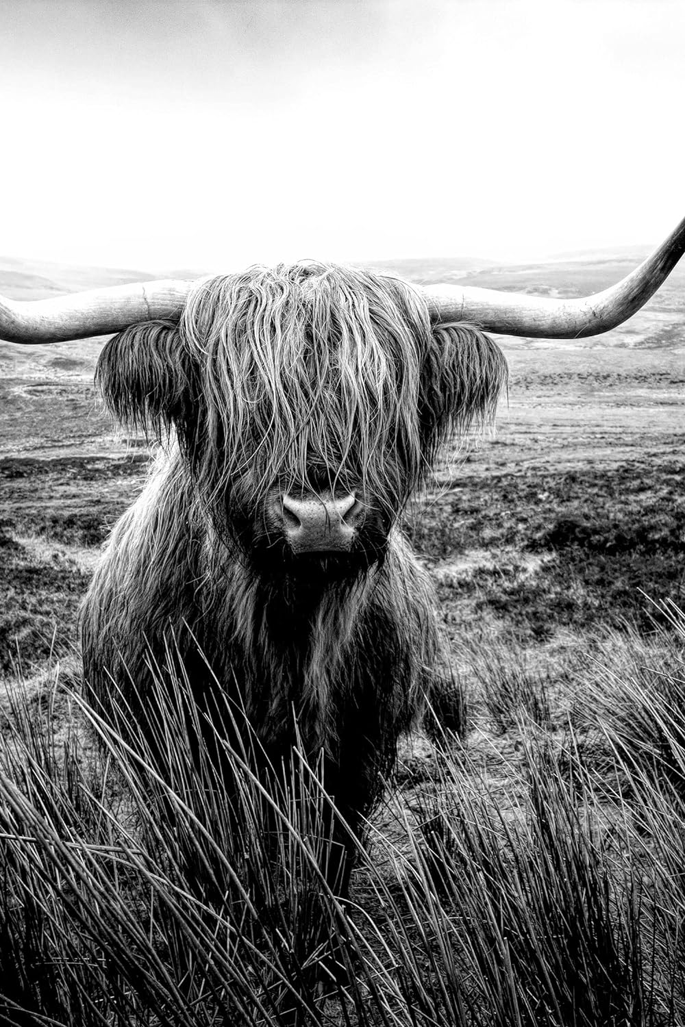 Pixxprint Glasbild | Wandbild aus Echtglas | Highland Rind mit grossen Hörnern Steppe, Monochrome |