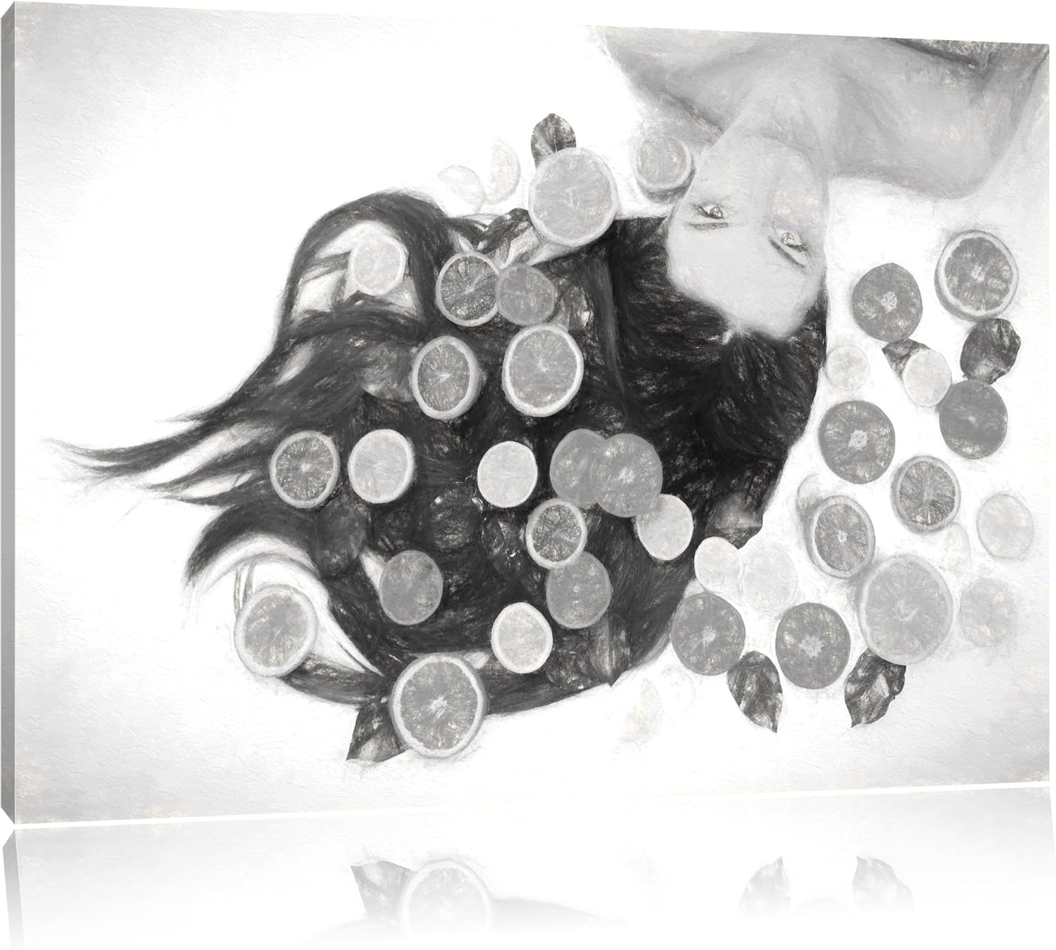 Pixxprint Hübsche Frau mit Obstscheiben Kohle Zeichnung Effekt, Format: 100x70 auf Leinwand, XXL rie