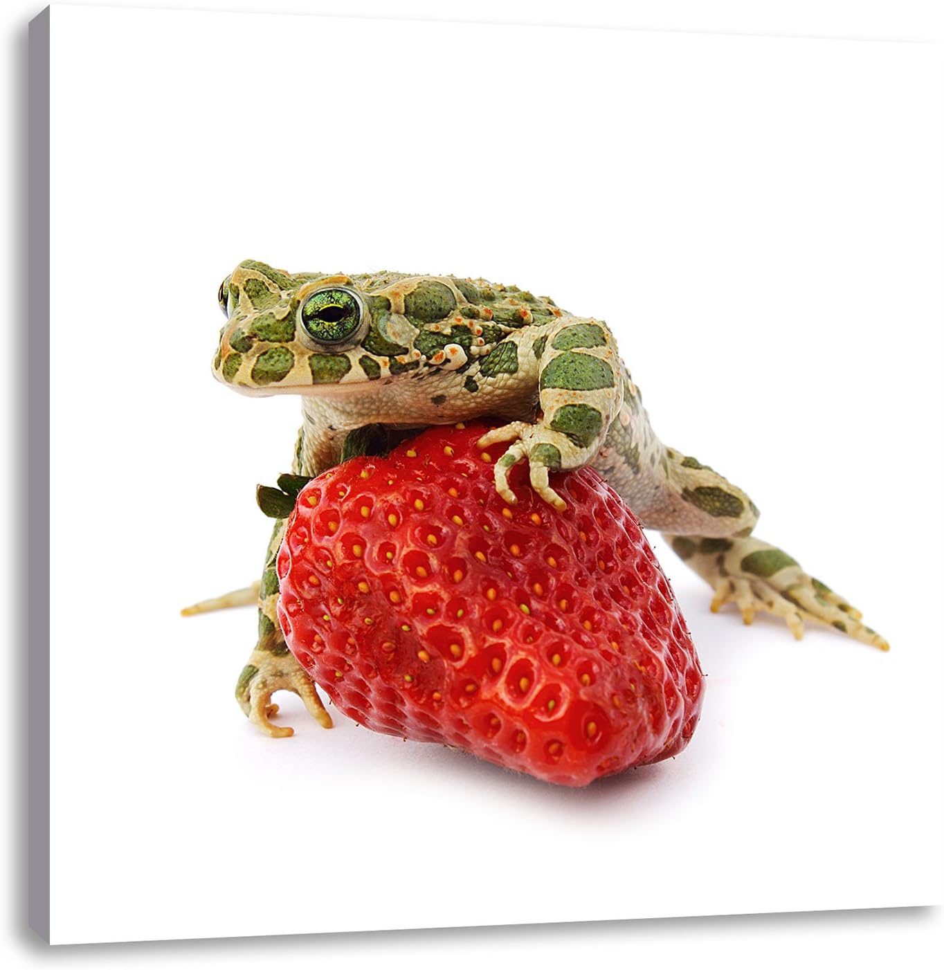 Pixxprint Kleiner Frosch sitzt auf Erdbeere als Leinwandbild/Grösse: 70x70 cm/Wandbild/Kunstdruck/fe