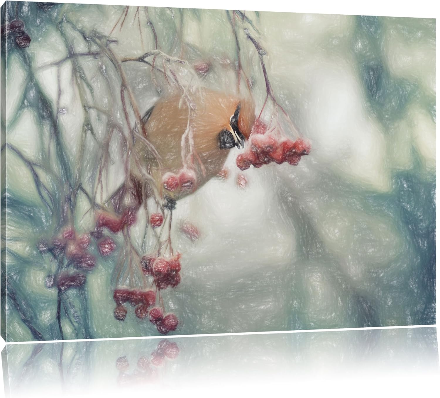 Pixxprint Kleiner Vogel im Vogelbeerbaum Bunstift Effekt, Format: 100x70 auf Leinwand, XXL riesige B