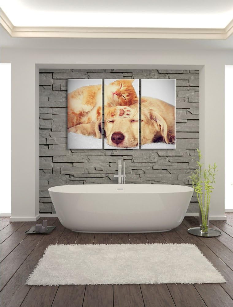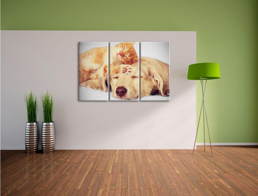 Pixxprint Kätzchen und Welpe schlafen B&W Detail 3-Teiler Leinwandbild 120x80 Bild auf Leinwand