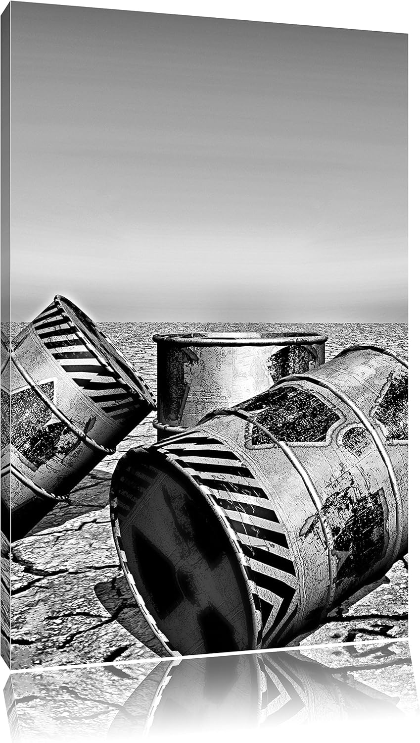 Pixxprint Monocrome, Atommüllfässer in ausgetrockneter Wüste, Format: 100x70 auf Leinwand, riesige B