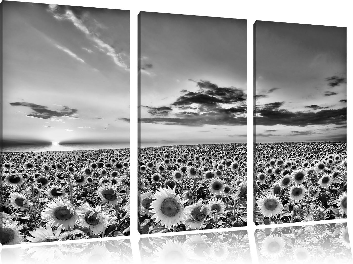 Pixxprint Monocrome, Sonnenuntergang am Sonnenblumenfeld 3-Teiler Leinwandbild 120x80 Bild auf Leinw