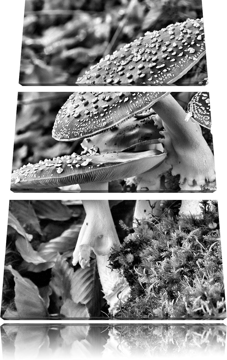 Pixxprint Monocrome, Vier Fliegenpilze auf Waldboden 3-Teiler Leinwandbild 120x80 Bild auf Leinwand
