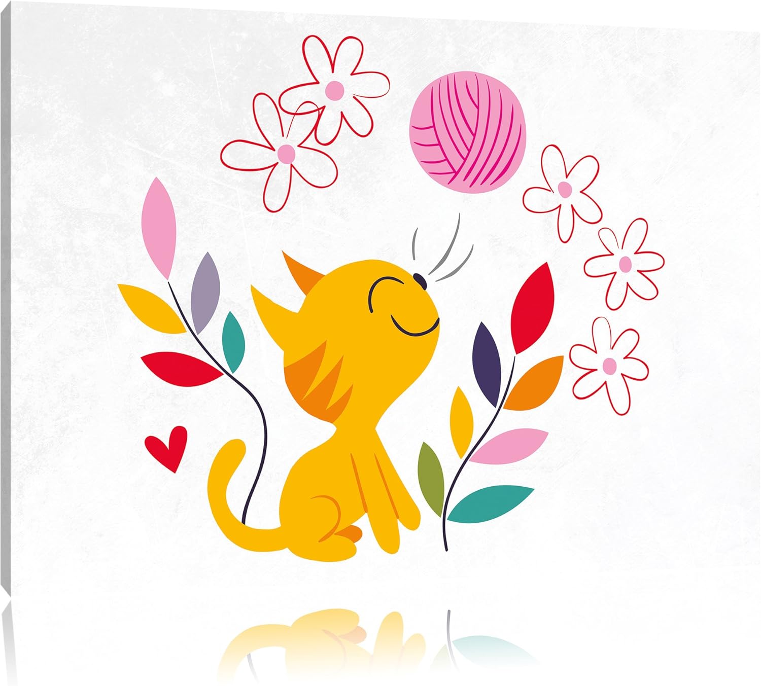 Pixxprint Niedliche Katze mit Wollknäuel als Leinwandbild/Grösse: 100x70 cm/Wandbild/Kunstdruck/fert