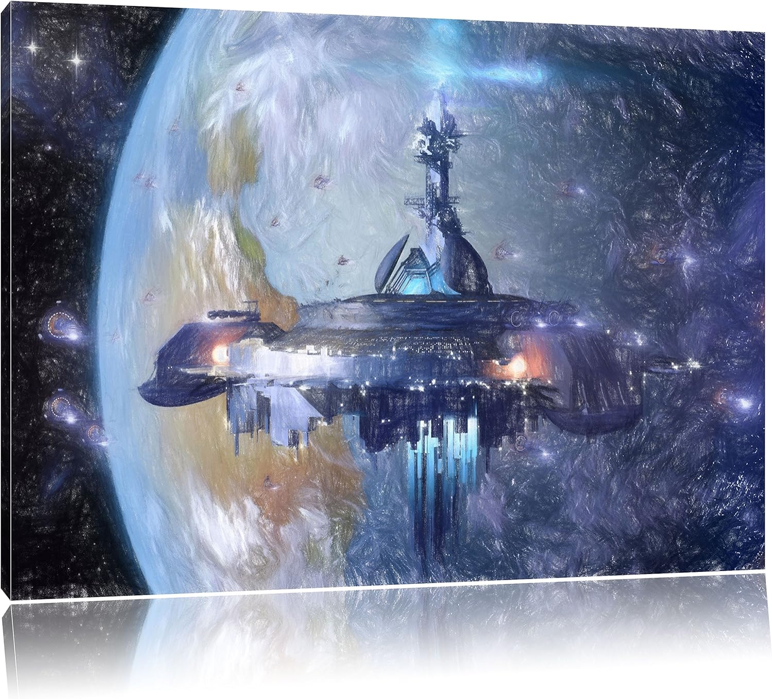 Pixxprint Raumschiff vor der Erde / 100x70cm Leinwandbild bespannt auf Holzrahmen/Wandbild Kunstdruc