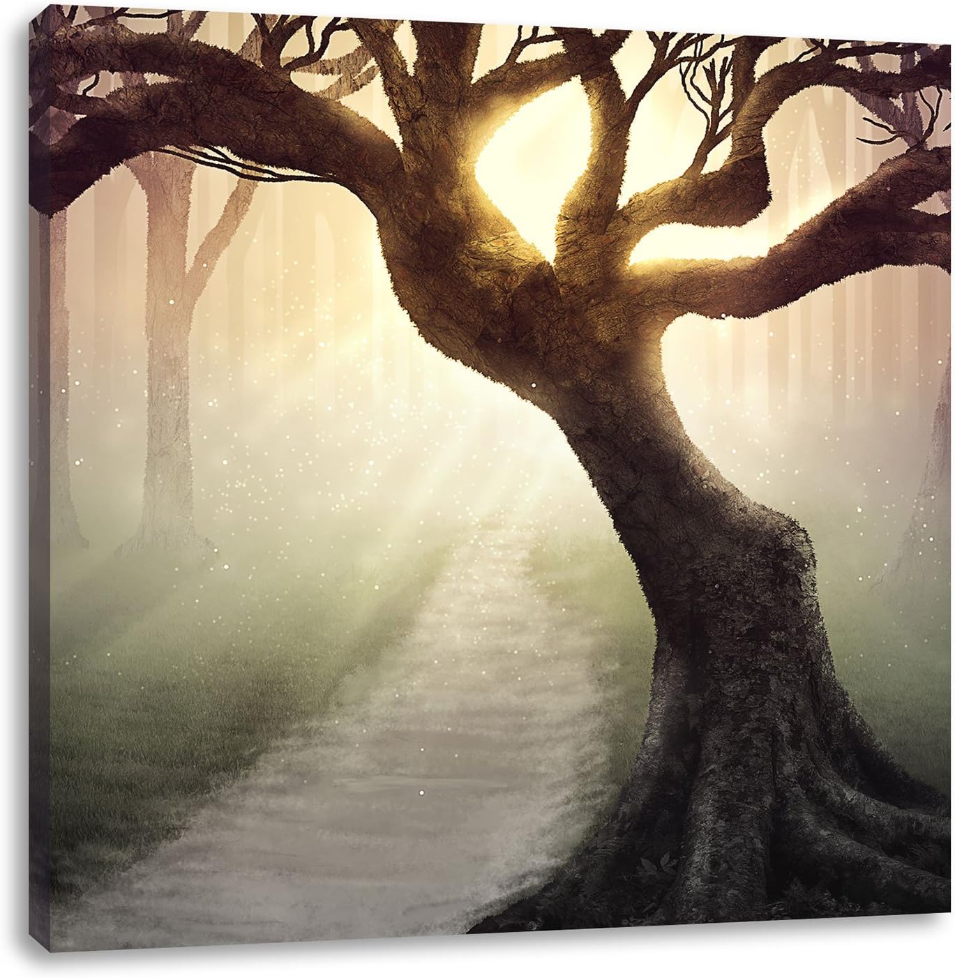 Pixxprint Riesiger Baum am Waldweg Schwarz/Weiss, Format: 70x70 auf Leinwand, 70x70