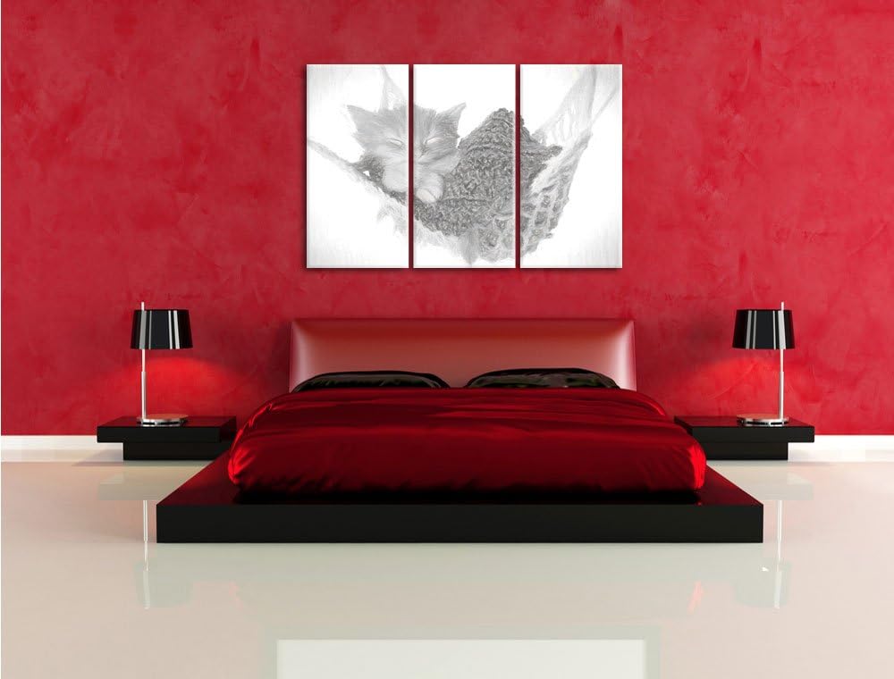 Pixxprint Schlafendes Katzenbaby in Hängematte Kohle Zeichnung Effekt 3-Teiler Leinwandbild 120x80 B
