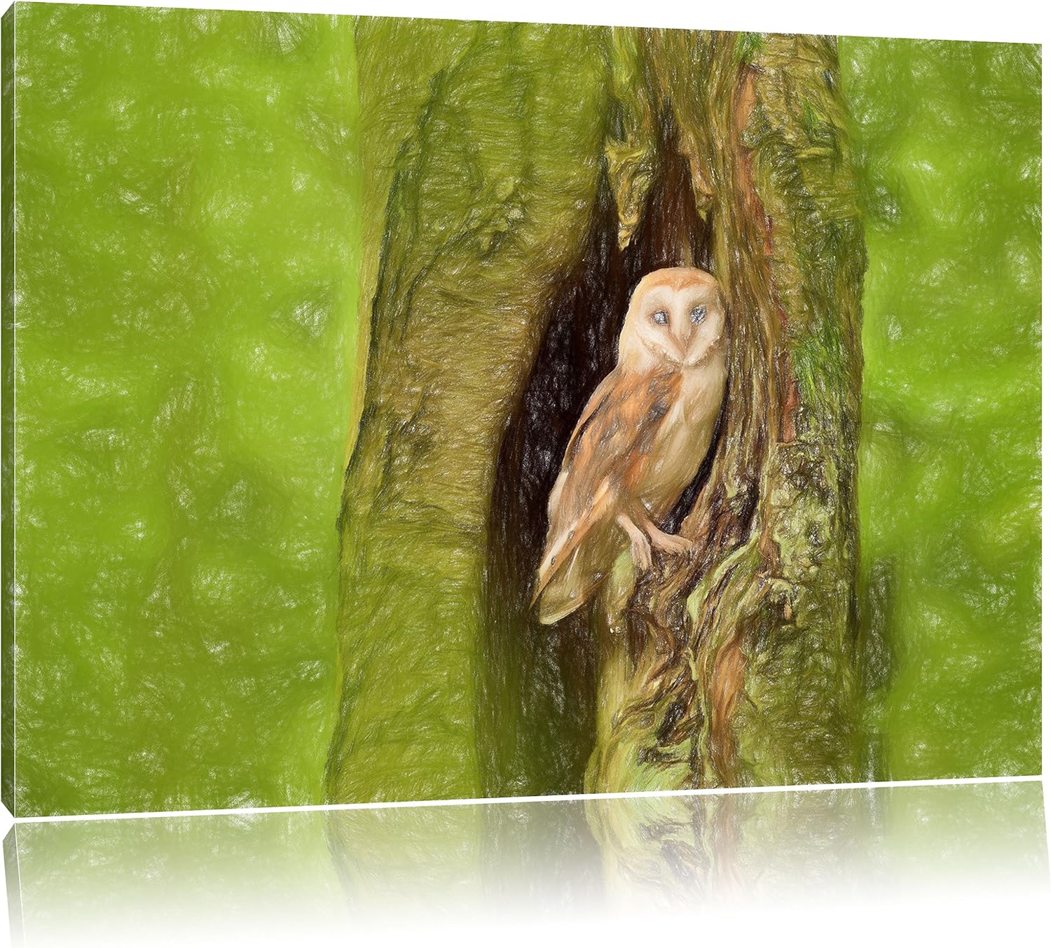 Pixxprint Schleiereule in der Baumhöhle Kunst Buntstift Effekt, Format: 100x70 auf Leinwand, XXL rie