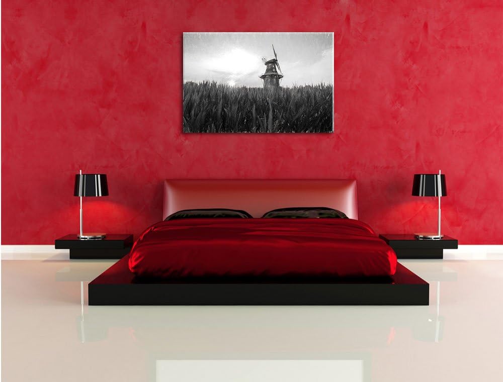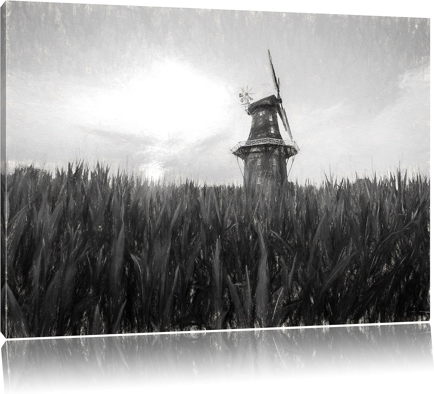 Pixxprint schöne Windmühle auf Dem Feld Kunst Kohle Effekt, Format: 100x70 auf Leinwand, XXL riesige