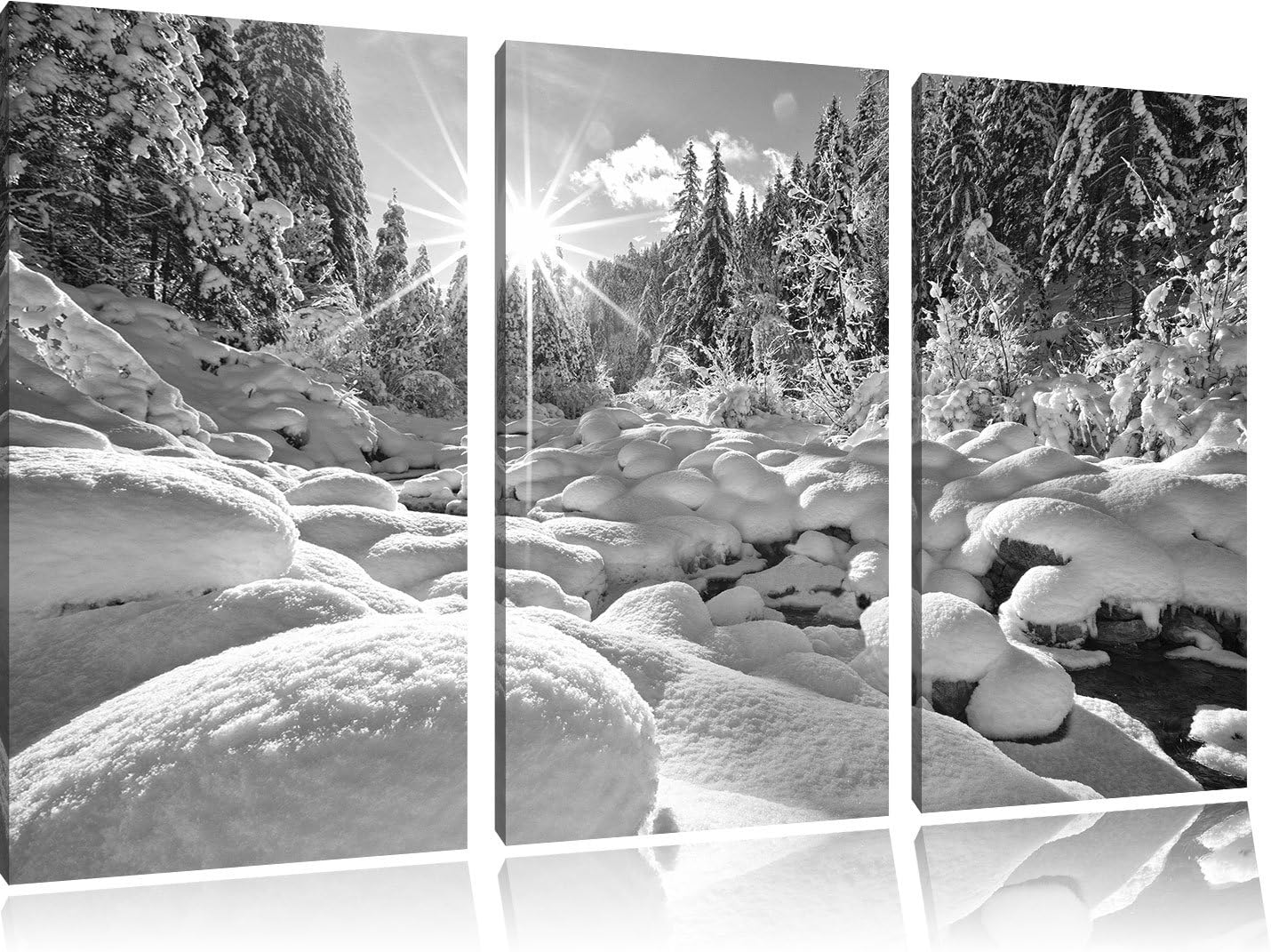 Pixxprint Sonnenstrahlenbedeckten Wald B&W / 3-Teilig/Gesamtmass 120cm Leinwandbild bespannt auf Hol