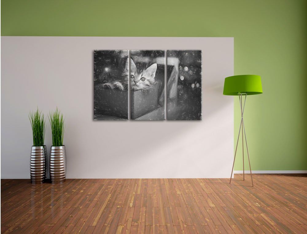 Pixxprint süsses Kätzchen in der Box Kunst Kohle Effekt 3-Teiler Leinwandbild 120x80 Bild auf Leinwa