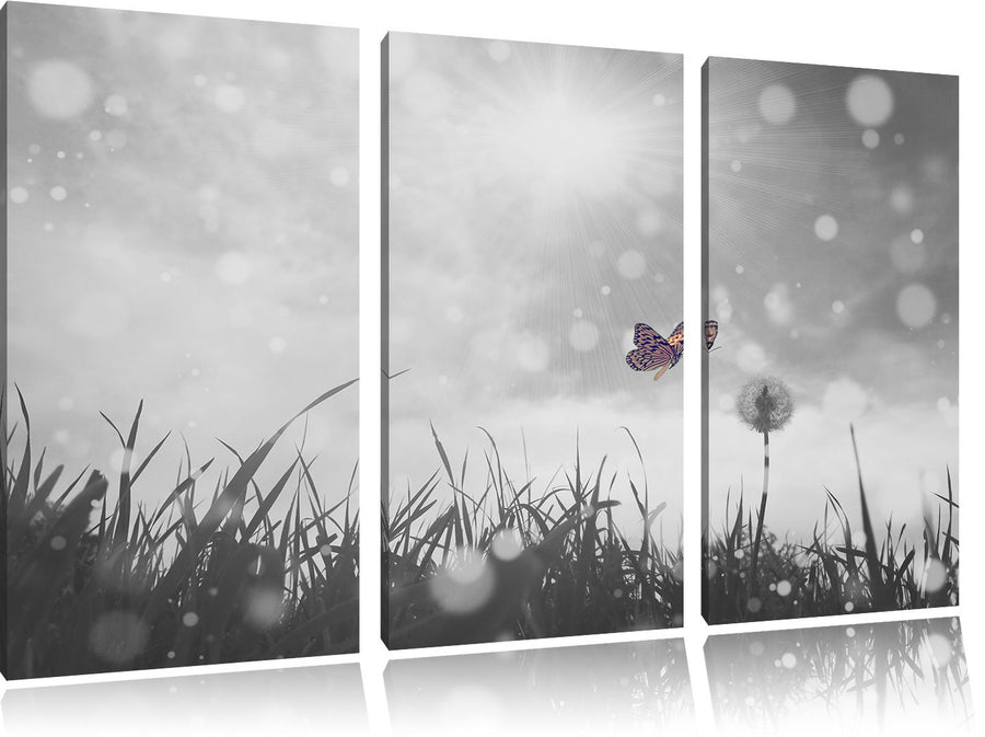 Pixxprint zarter Schmetterling fliegt zu Pusteblume B&W Detail 3-Teiler Leinwandbild 120x80 Bild auf