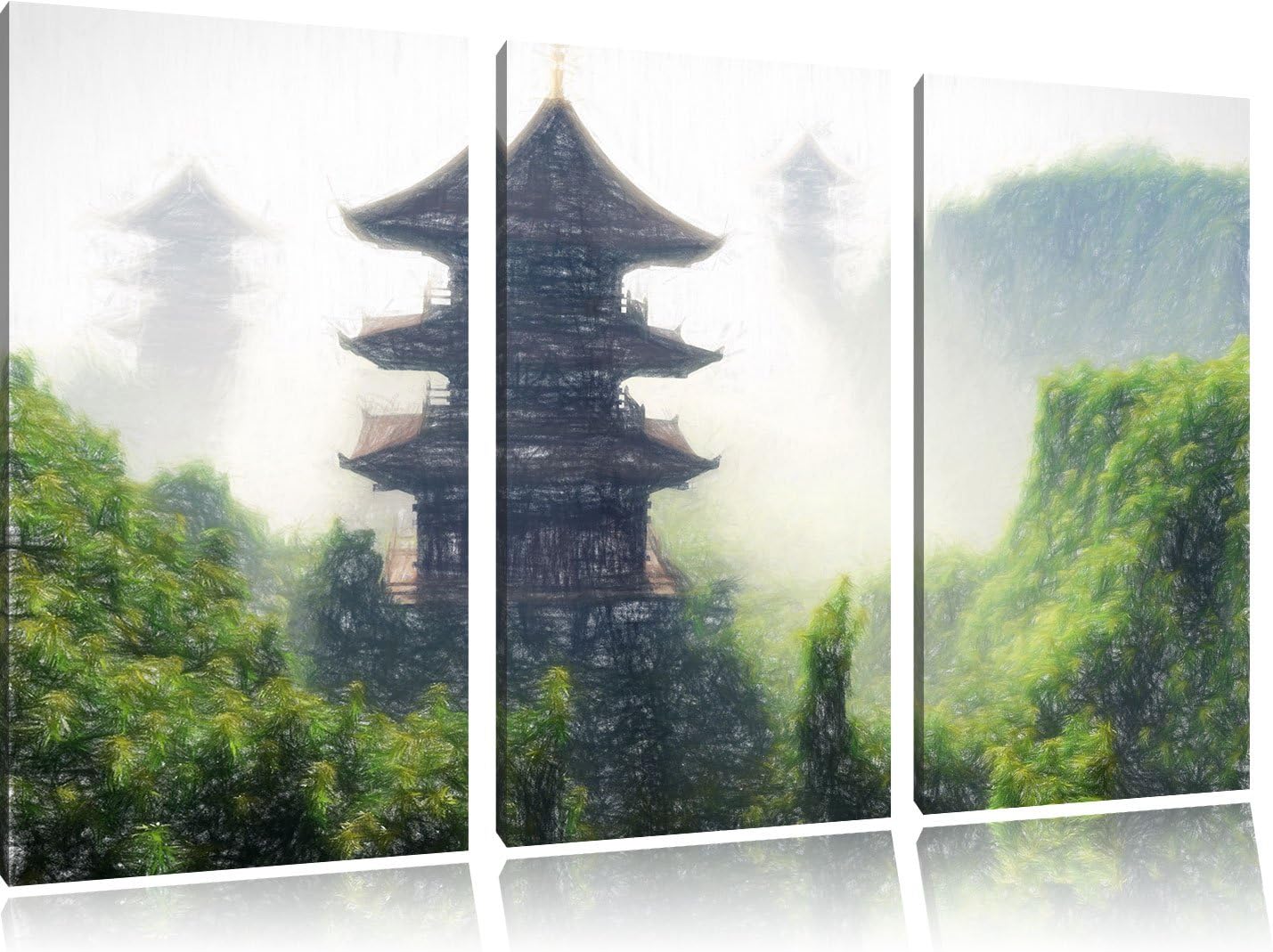 Pixxprint chinesische Häuser Kunst Buntstift Effekt 3-Teiler Leinwandbild 120x80 Bild auf Leinwand