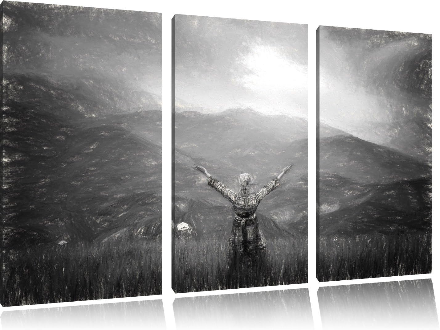 Pixxprint eine Berg Farm in Asien im Sonnenschein Kunst Kohle Effekt 3-Teiler Leinwandbild 120x80 Bi