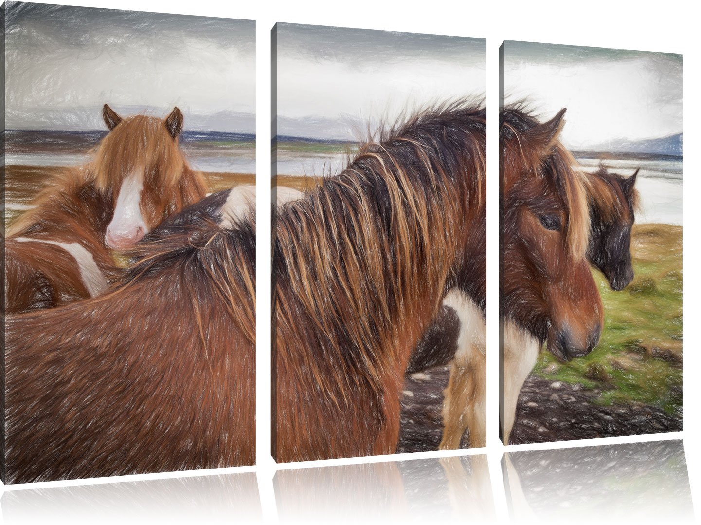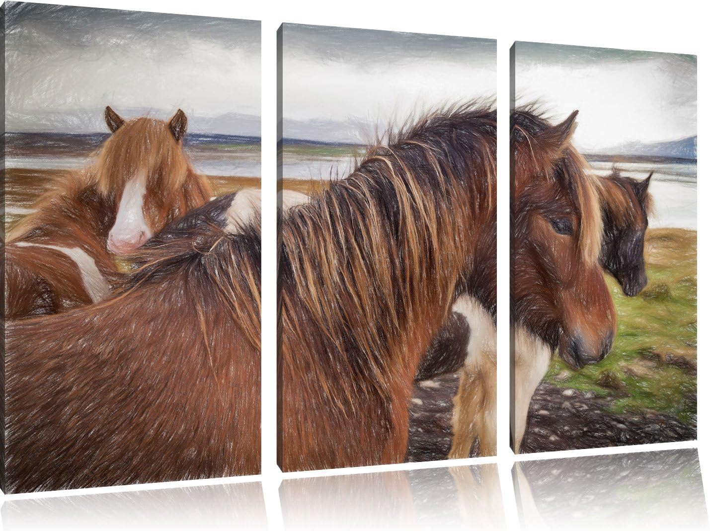 Pixxprint Herde aus schönen Wildpferden Kunst Buntstift Effekt 3-Teiler Leinwandbild 120x80 Bild auf