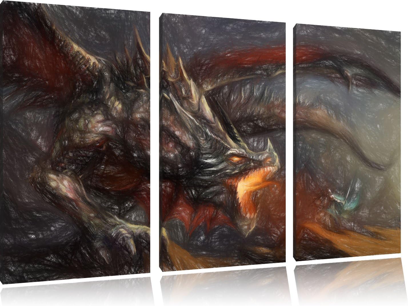 Pixxprint Kampf zwischen Mensch und Drache Bunstift Effekt 3-Teiler Leinwandbild 120x80 Bild auf Lei