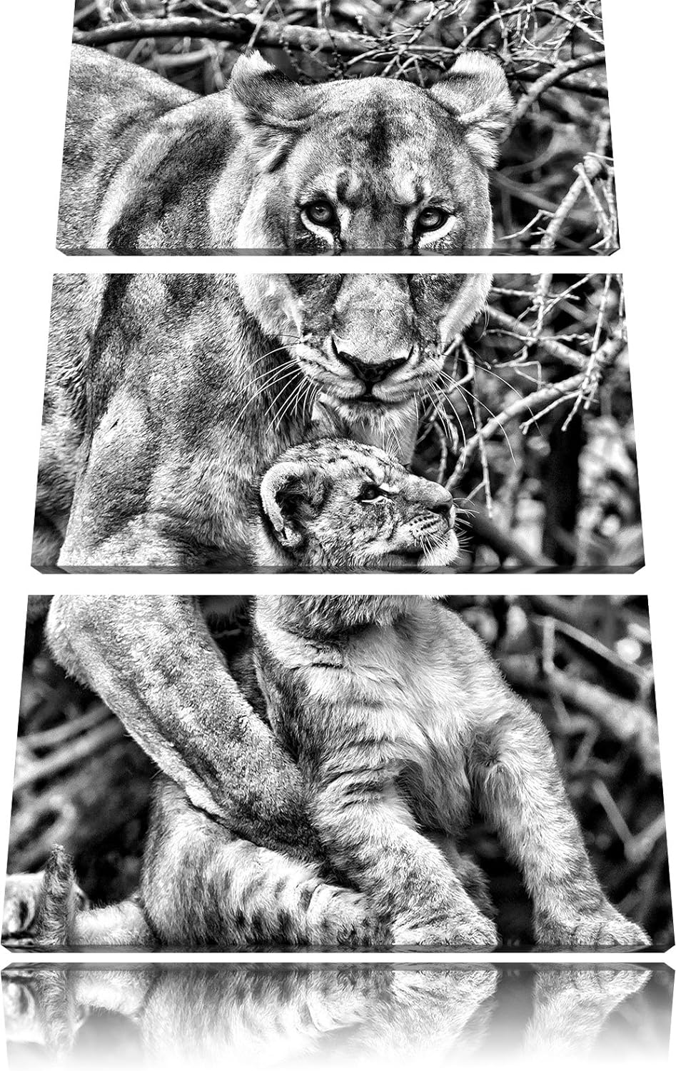 Pixxprint Löwin spielt mit Jungtier als Leinwandbild/Grösse: 3 Teilig (120x80 cm) cm/Wandbild/Kunstd