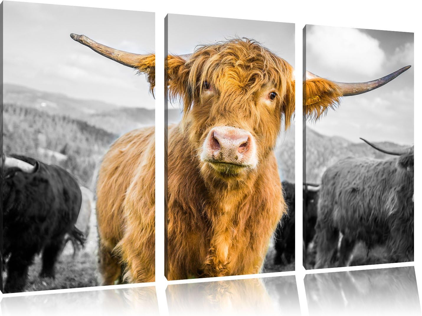 Pixxprint Niedlicher Blick Einer Kuh an der Weide B&W Detail 3-Teiler Leinwandbild 120x80 Bild auf L