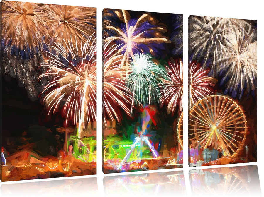 Pixxprint Riesenrad mit Feuerwerk als Leinwandbild/Grösse: 3 Teilig (120x80) cm/Wandbild/Kunstdruck/