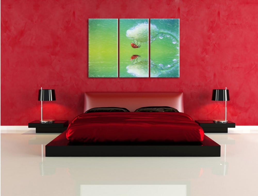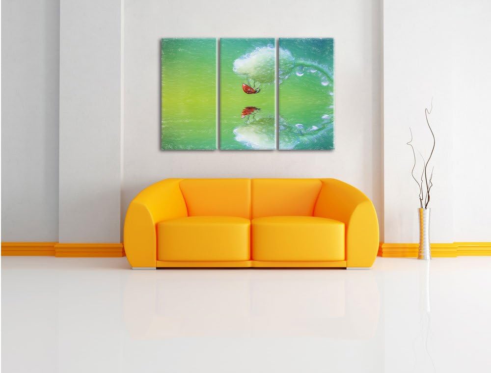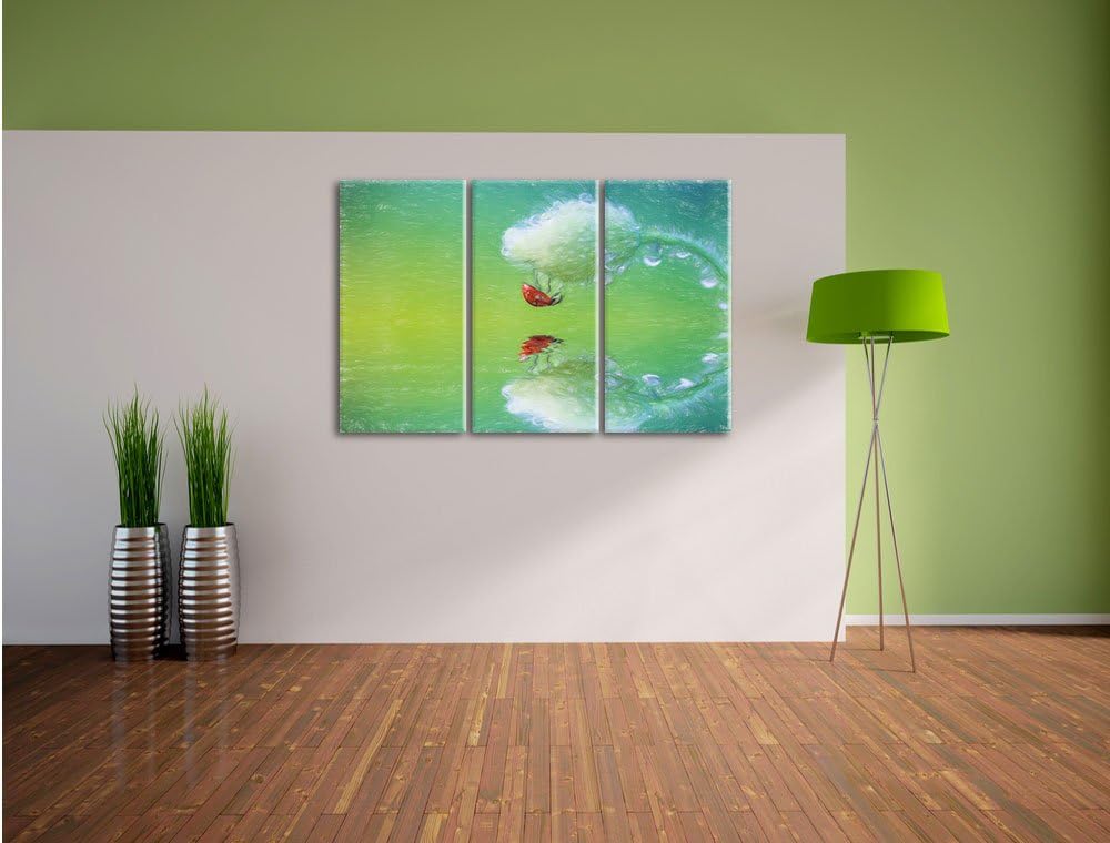 Pixxprint Roter Marienkäfer hängt kopfüber an Einer Mohnblume Kunst Buntstift Effekt 3-Teiler Leinwa