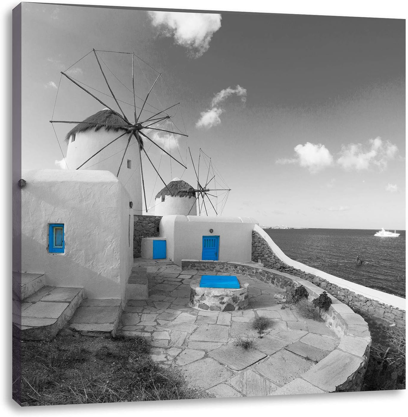 Pixxprint süsse Windmühlen im Mittelmeer schwarz/weiss, Format: 70x70 auf Leinwand, 70x70
