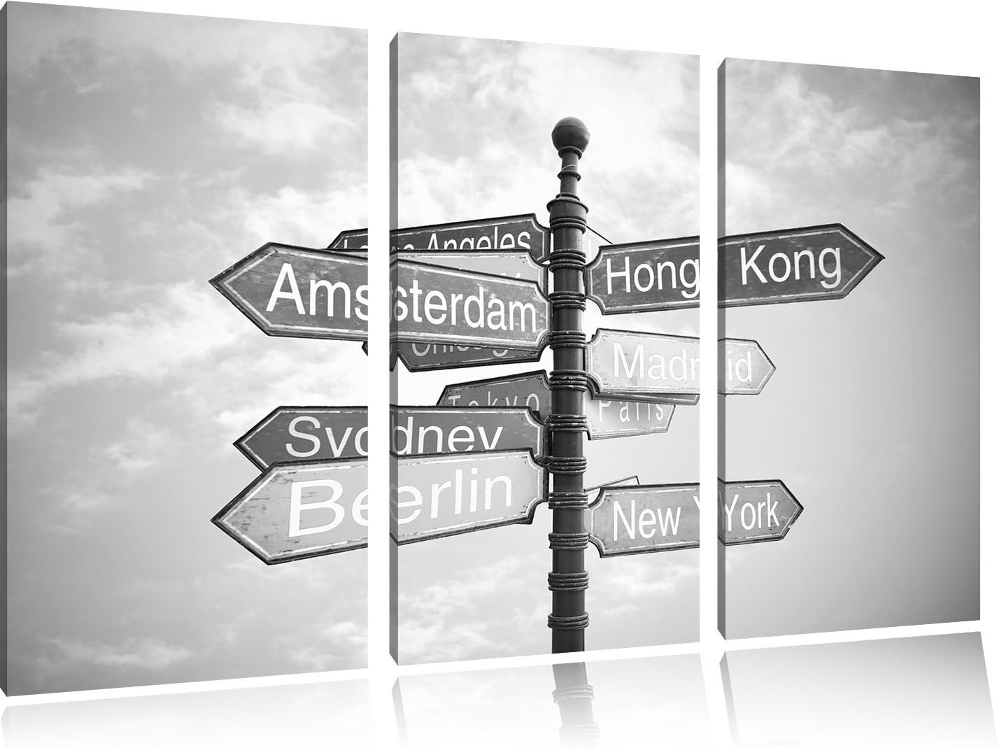 Pixxprint Städte Wegweiser Kunst B&W als Leinwandbild | Grösse: 3 Teilig (120x80) | Wandbild| Kunstd