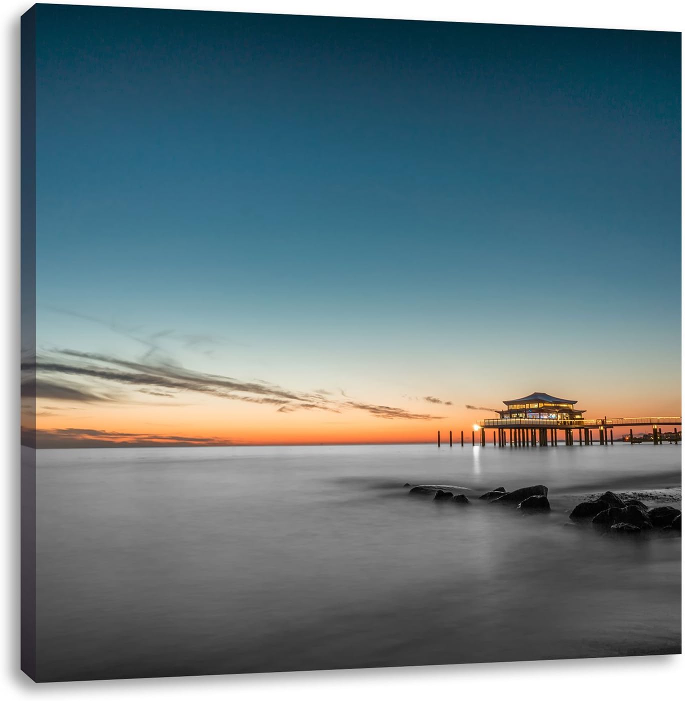 Pixxprint Timmendorfer Strand bei Sonnenuntergang Schwarz/Weiss, Format: 70x70 auf Leinwand, 70x70