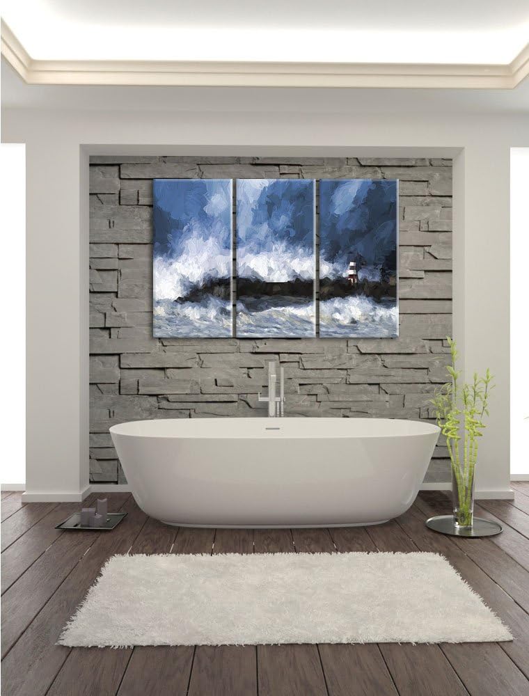 Pixxprint Tobendes Meer mit Leuchtturm als Leinwandbild | Grösse: 3 Teilig (120x80) | Wandbild| Kuns