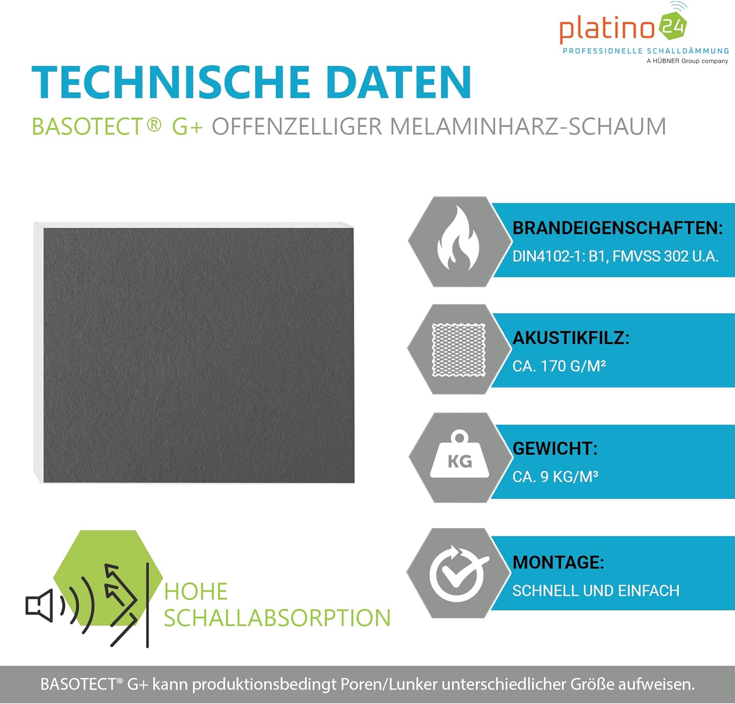 - BASOTECT G+: Die offenzellige Struktur ermöglicht das Eindringen der Schallwellen und reduziert somit den Hall. Zudem ist Basotect G+ nach DIN4102-1:B1 schwer entflammbar und bis +240°C temperaturbeständig.